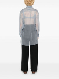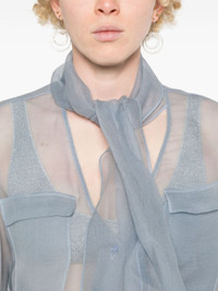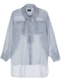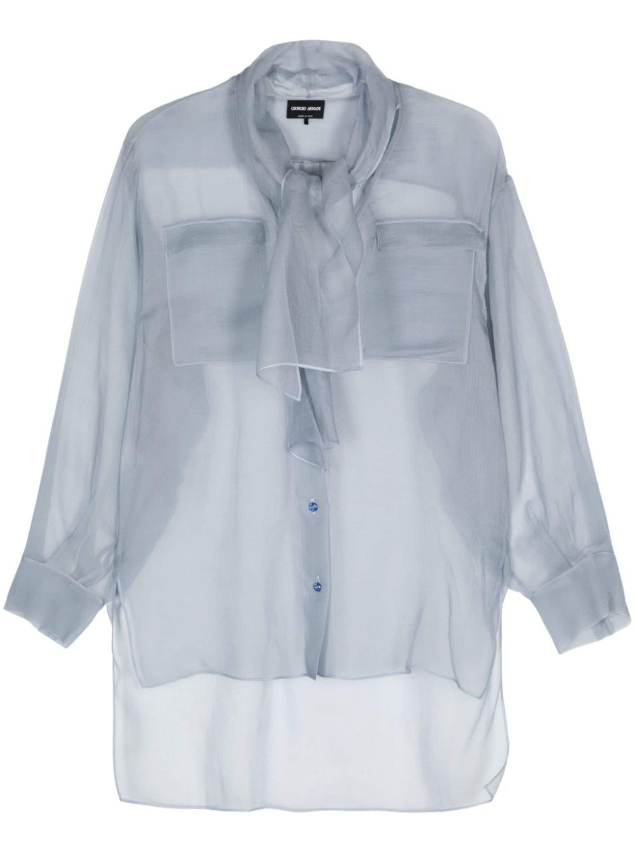 light blue silk organza semi-sheer construction attached scarf V-neck long sleeves with buttoned cuffs chest flap pockets short side slits high-low hem front button fastening Size & Fit Model Measurements: Height: 1.75 m Bust/Chest: 83.0 cm Hips: 89.0 cm Waist: 63.0 cm Model wears size 40 Fabric and Care Designer Style ID: GW000260TE10875 Designer Colour: U8061 SILVER GREY Composition: Silk 100% Washing instructions: Dry Clean Only Made in Italy