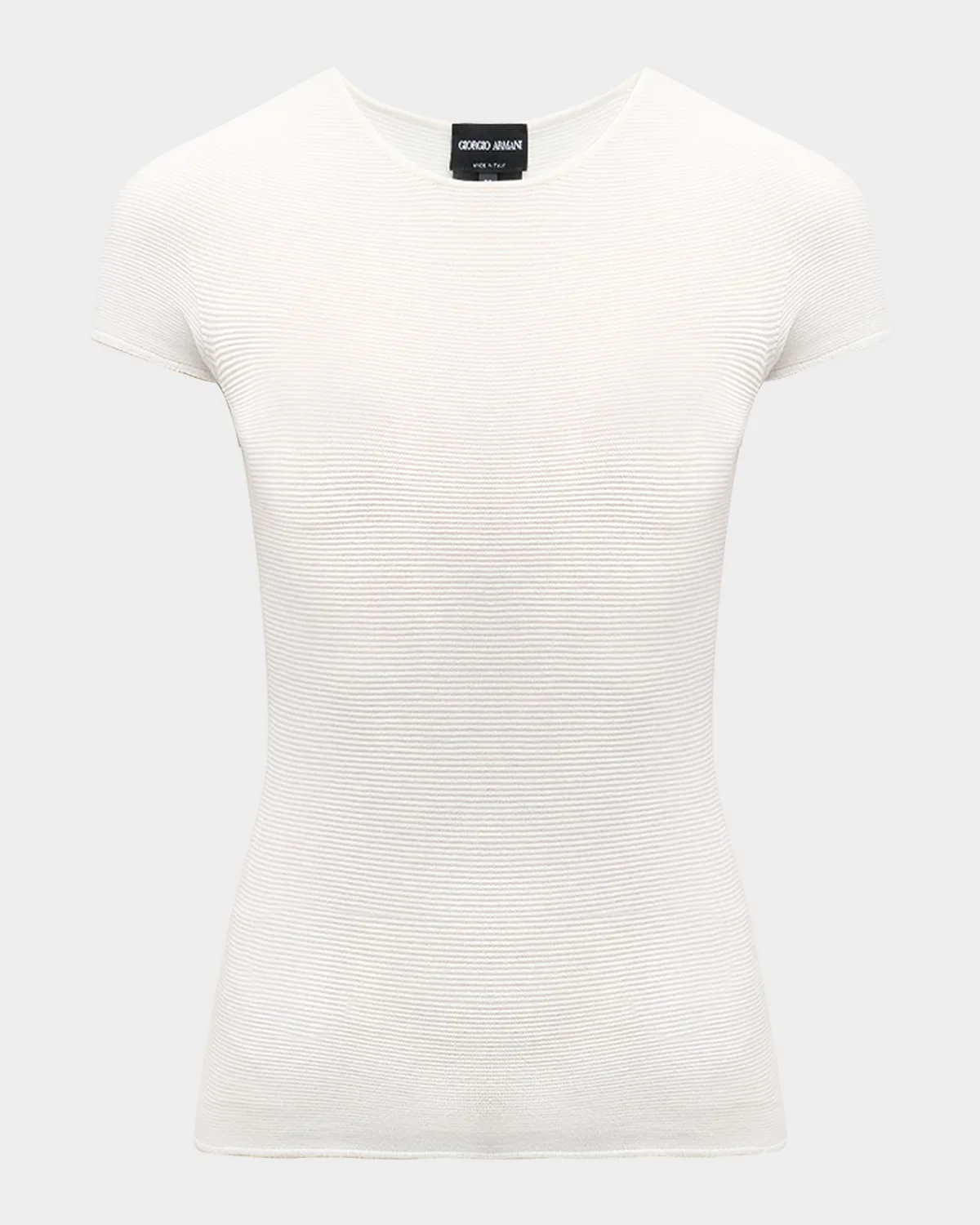 Giorgio Armani solid ribknit tee. Scoop neckline. Short sleeves. Fitted. Straight hem. Pullover style. Viscose/polyester. Made in Italy. Size Note: Height: 5'10"/ waist 24"/ hips 36"/ bust 34" Model is wearing size 38IT