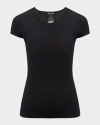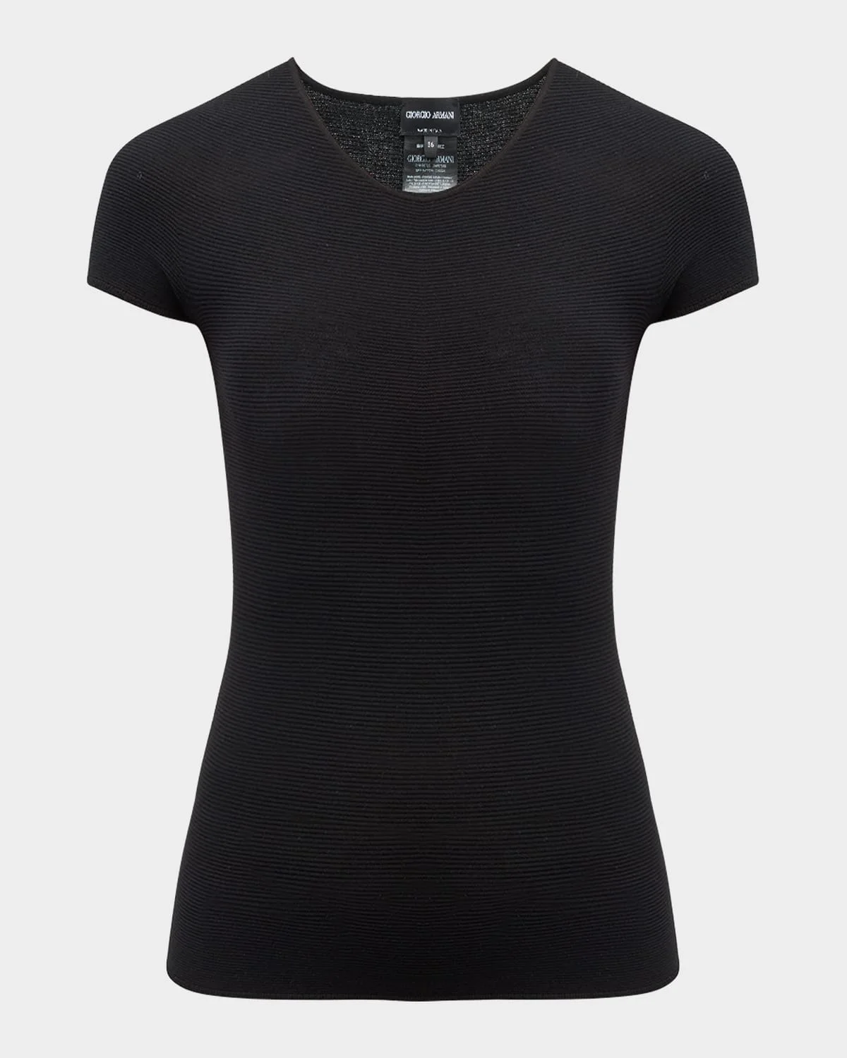 Giorgio Armani solid knit tee. Scoop neckline. Short sleeves. Fitted. Straight hem. Pullover style. Viscose/polyester. Made in Italy. Size Note: Height: 5'10"/ waist 24"/ hips 36"/ bust 34" Model is wearing size 36