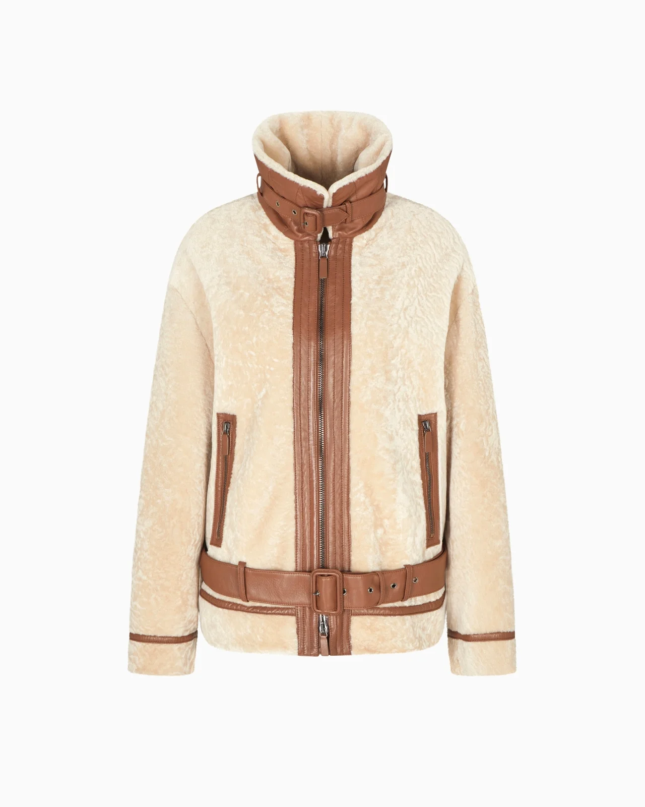 Blouson made of exquisite South African shearling lamb, with a distinctive brushed Astrakhan effect, a quality characterised by its cosy feel and light weight, while still being very warm. The style is defined by contrasting nappa leather inserts, which follow the profiles of the zip closure, zip pockets and two adjustable straps, one on the collar and the other at the hem of the garment. A sophisticated offering with careful attention to detail, designed to complete daytime looks. The piece is part of the New Normal selection, an offering that reinterprets the brand’s archive looks with a modern twist. Pieces in elongated and fluid shapes and with an androgynous flavour dress the feminine silhouette with elegance for day-to-night looks. This season it comes in a natural colour palette animated by a series of chevron motif and houndstooth shapes, a clear reinterpretation of pieces "stolen" from the male wardrobe with a feminine twist. Stand collar with nappa leather strap Zip closure with nappa leather double pull tab Two vertical zip pockets Contrasting nappa leather strap Contrasting nappa-leather trim Inside pocket with nappa leather embossed logo Silk twill lining Lightly padded Length: 61 cm Made in Italy Product Code: GW002046AF19600U1029