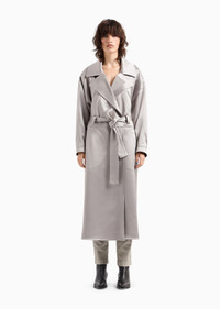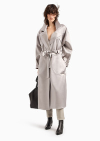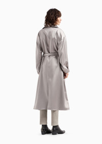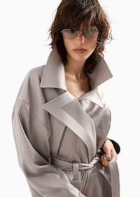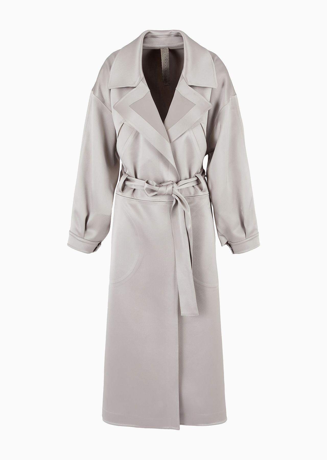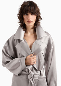 Trench coat with generous volumes, made of technical duchess satin, the perfect reinterpretation of a classic, feminine piece given an edgy, modern touch. Its wraparound volumes are secured by a belt at the waist and embellished with heat-sealed details. A versatile item that can be paired with skirts or trousers for effortless, sophisticated daytime looks. Product Code: GW000234TE108411U6092 Details Composition 75% Acetate 25% Polyester Large notched lapels Long sleeves with dropped shoulders Two front slant pockets Two welt pockets Belted waist Heat-sealed seams and details Unlined Length: 125 cm Made in Italy Fitting The model is 178 cm tall and is wearing size 38/S