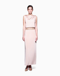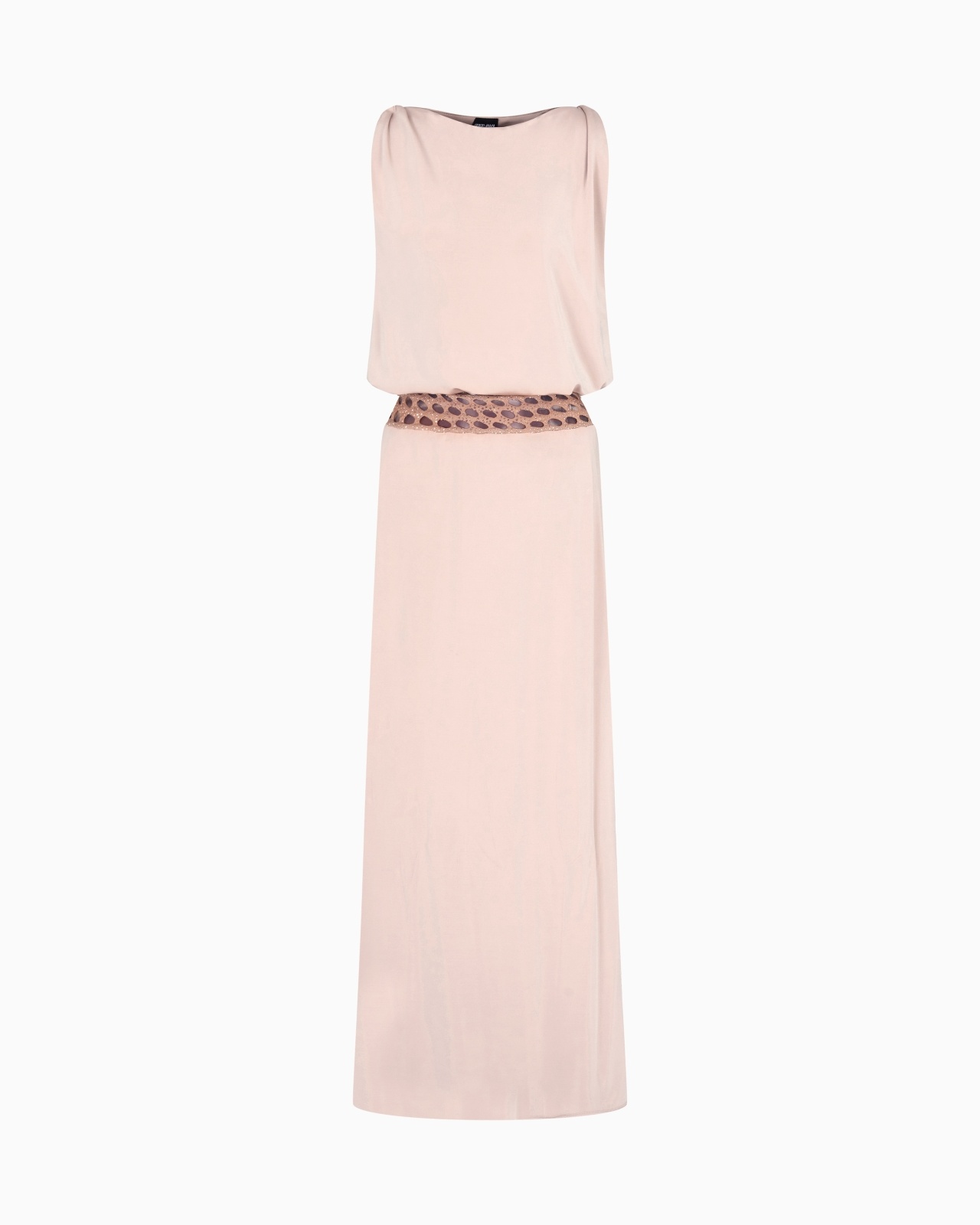 Long dress made of shiny viscose jersey, featuring a relaxed, slinky line. The sleeveless style features a bodice with an oval neckline, balloon tuck at the waist and straight skirt; the applied belt detail creates an embroidered and semi-transparent effect, elegantly highlighting the waist. A sophisticated offering that adorns the feminine silhouette without constraint, perfect for accompanying looks suitable for different occasions. Oval neckline Sleeveless design Balloon-fit bodice to the waist Embroidered belt detail Straight skirt draped at the hem Unlined Length: 110 cm Made in Italy Product Code: GW001049AF15530U6071