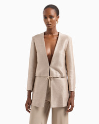 Distinctive jacket made from cotton and viscose, with an unusual raffia-effect motif that gives the piece structure. The style features a suede tie closure, two slash pockets and ties at the cuffs. Versatile and laid-back, it completes daytime looks with a sophisticated touch, teamed with the collection’s trousers. V neck Monochromatic suede tie closure Two slant pockets Overlapping at the waist Suede tie detail at the cuffs Lined Length: 70 cm Made in Italy Product Code: GW001080AF15521U6071