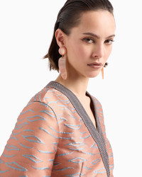 Refined and exquisite short jacket, made of a silk blend and animated by the rich two-tone jacquard with an urban tiger motif, a recurring theme of the collection, which interprets the animal print in the brand’s hallmark style. The V-neck style has a concealed button fastening, is embellished with contrasting crinoline trim and elbow-length shaped sleeves. A refined offering, the perfect complement to sophisticated looks dedicated to the evening and special occasions. V neck Concealed one-button closure Elbow-length shaped sleeves Contrasting crinoline piping Rounded hemline Central back vent Unlined Length: 54 cm Made in Italy Product Code: GW000853TE13977F4034