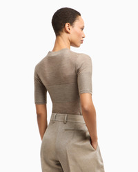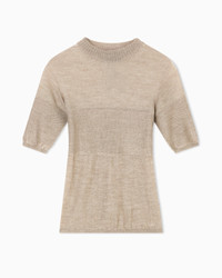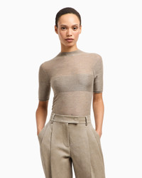 Short-sleeved jumper made from cashmere and silk with a semi-sheer effect that comes in a stylish and versatile colour palette. The style is distinguished by a textured, monochromatic insert on the front and sleeves. A refined offering ideal for teaming with the collection’s trousers for perfect daytime laid-back looks. The piece is part of the New Normal selection, an offering that reinterprets the brand’s archive looks with a modern twist. Pieces in elongated and fluid shapes and with an androgynous flavour dress the feminine silhouette with elegance for day-to-night looks. This season it comes in a natural colour palette animated by a series of chevron motif and houndstooth shapes, a clear reinterpretation of pieces "stolen" from the male wardrobe with a feminine twist. Fineness: 18 Slight upright collar Short sleeves Monochromatic moss stitch insert Made in Italy Product Code: GW002139AF19810U6172