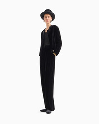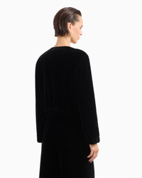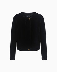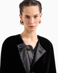 Sophisticated short jacket made of lush, smooth velvet with black satin details. The crew-neck style has a single-breasted closure with special logo buttons and a covered elasticated detail at the cuffs and hem. Its streamlined, elegant line dresses the feminine silhouette with elegance, for perfect evening wear looks. Product Code: GW001352TE108311UC001 Details Composition 80% Viscose 20% Mulberry silk Crew neck Single-breasted closure with special logo buttons Internal elastic at the cuffs and hem Lined Length: 48 cm Made in Italy