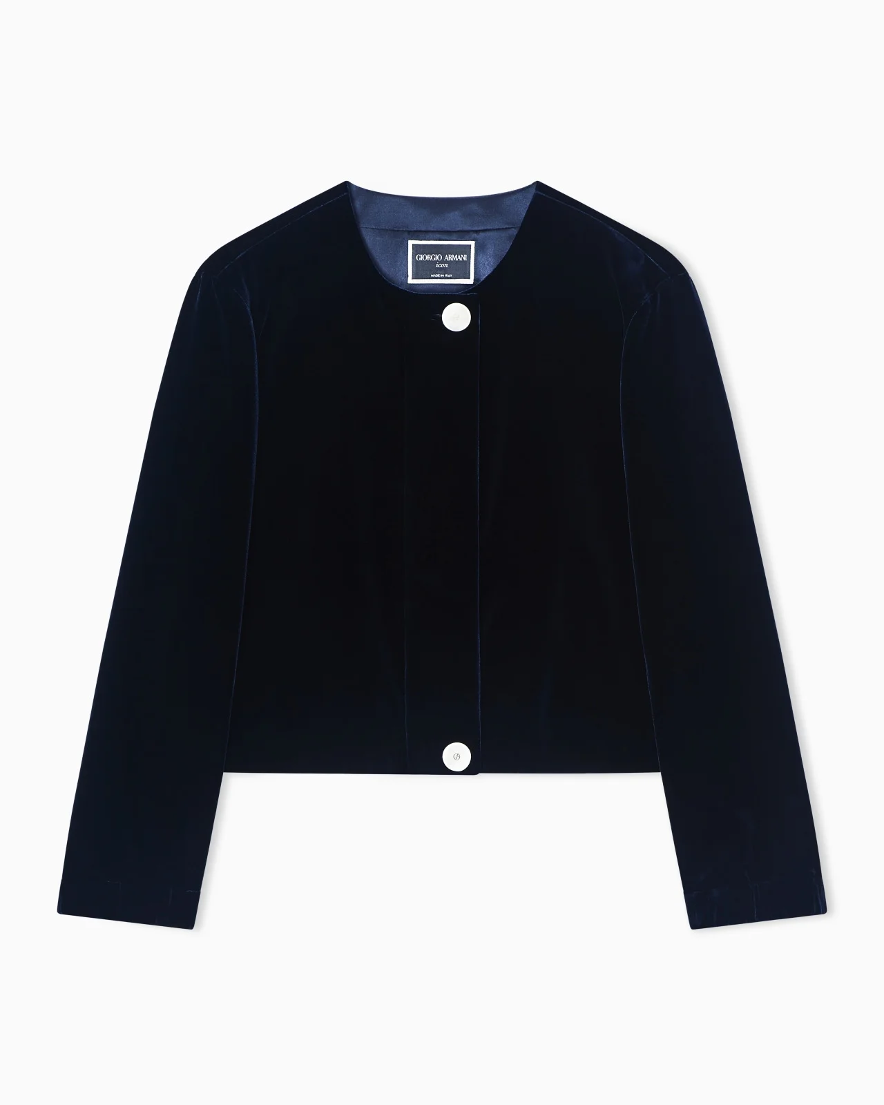 Short jacket made of velvet, the brand’s iconic fabric that is instantly recognisable thanks to its smooth feel and incredible ability to capture the light. Created using silk and viscose, it owes its particular silky feel to the special upward cut of the warp yarns. The crew-neck style is distinguished by the closure with logo buttons and the details at the cuffs and back with covered elastic, ensuring a perfect and comfortable fit. A refined offering, perfect to pair with the matching trousers and a silk shirt, for a elegant, feminine look. Crew neck Hanging sleeves Concealed button closure Two visible logo buttons detail on the placket Covered elastic at the cuff Covered elastic at the hem at the back Lined Length: 48 cm Made in Italy Product Code: GW002978TE10831UB115