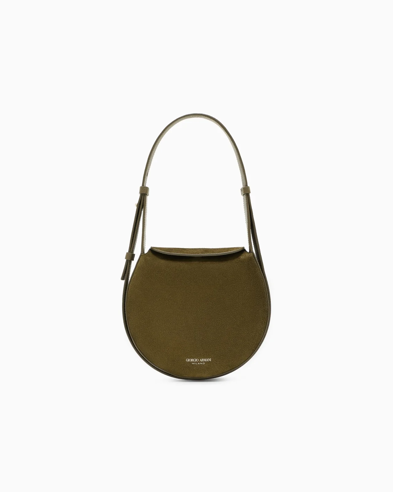 Small shoulder bag made of suede with matching pebbled calfskin details. A distinctive item thanks to its original shoulder strap, which is attached to the main bag by loops and can be adjusted and extended depending on the occasion to create a full or empty effect. An unstructured and lightweight accessory, featuring an almost complete absence of metalware, a flap and concealed magnetic button clasp and heat-stamped Giorgio Armani logo. Perfect for daytime use. Flap with concealed magnetic button clasp Adjustable strap with cap closure Internal pocket with heat-stamped Giorgio Armani logo Dual portability: shoulder and crossbody Heat-stamped Giorgio Armani logo on the bag’s front panel Measurements: 20.5 x 5 x 17 cm Made in Italy Product Code: GW001730AF18690M7083