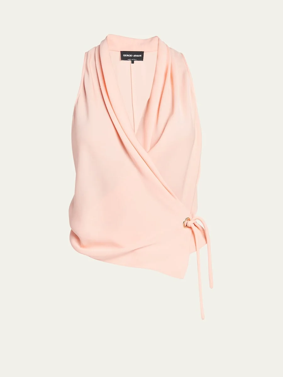 Giorgio Armani wrap blouse with self-tie waist V neckline Sleeveless Relaxed fit Silk Dry clean Made in Italy Model is 5'10"/177cm. Online Inquiries: BGS21_T5D8V| Store Inquiries: #4690301