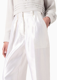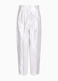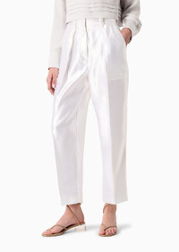 Straight trousers with essential design and relaxed volumes, made from linen and silk. This versatile style adorns the silhouette without constraint and is accented by the yarn’s glossy finish, perfect for creating unique evening looks as well. Product Code: 4SHPP138T04LJ1U0BN Details Composition 54% Linen 46% Mulberry silk Waistband with belt loops Fly closure with zip and small buttons Two slant pockets Two back welt pockets Unlined Cuff width: 17.5 cm Made in Italy Fitting The model is 178 cm tall and is wearing size 38/S