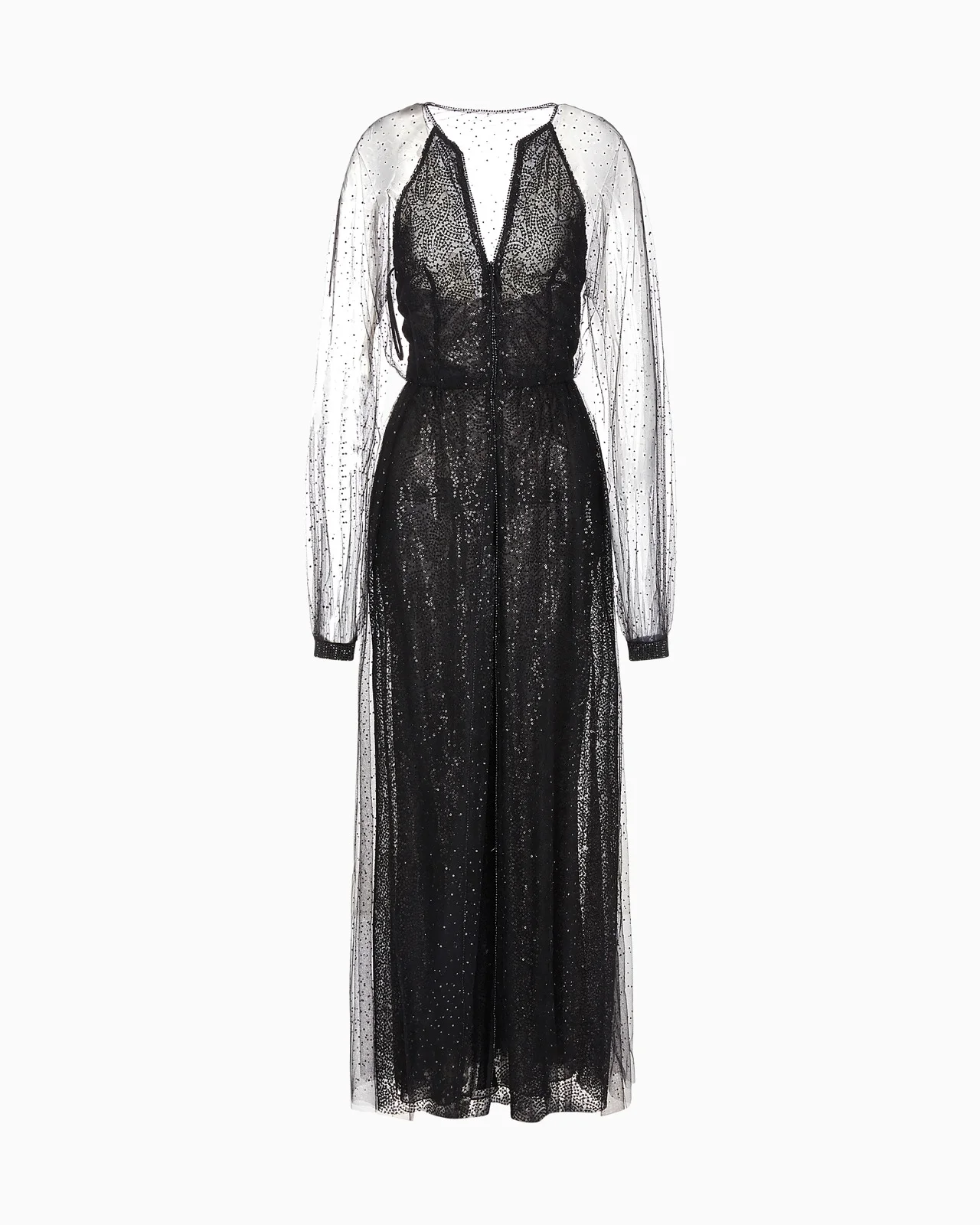 A shower of rhinestones covers the sensual, slinky lines of this silk long dress. The zip-opening V-neck style is embellished with a tulle layer embroidered with black sequins, adding sparkle to the dress. A garment that conquers through its refined elegance, the perfect dress for the most special occasions. Product Code: 3SHVR052T03X21PZ01 Details Composition 100% Polyamide V neck Zip closure Tulle overlay with all-over black sequin embroidery Long sleeves Heat-sealed pave rhinestone cuffs Doubled-layered fabric Made in Italy