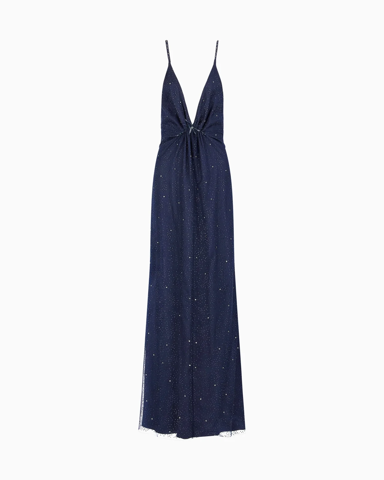 A bright starry sky embellishes the lines of this silk-blend long dress which comes in a deep navy blue. The style has a sophisticated silhouette, with a plunging front and back neckline, small gathers held by an embroidered patch and an invisible zip fastening on the back. A shower of blue rhinestones and small silver stars, applied on a thin layer of blue tulle, bring radiance and a sophisticated allure to this elegant eveningwear piece. <br>The piece is part of the exclusive collection that celebrates the connection between Giorgio Armani and the world of Hollywood. A colour palette of deep blues combines with a profound and ever-elegant black, to create a sparkling, luxurious selection inspired by the limelight and most exclusive Hollywood parties. Extremely sophisticated pieces with iconic lines are made of velvets, silks and satins enlivened by crystal and rhinestone embellishments and refined workmanship. Looks for him and her, designed for evenings and special occasions. Slim shoulder straps with applied rhinestones Front V neck Front gathering details held by a matching sequin-embroidered patch Tulle top layer with heat-adhesive embroidery created with blue rhinestones and small silver stars V-neck at the back Unlined Measurements: 110 cm from the waist Made in Italy Product Code: GW001485AF17829ZZ017