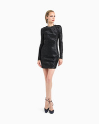 A bright starry sky embellishes the lines of this silk-blend short dress. The style has a minimalist construction, with long sleeves, zipped cuffs, slight draping at the hem and an invisible zip fastening at the back. A shower of black rhinestones and small silver stars, applied on a thin layer of black tulle, bring radiance and a sophisticated allure to this eveningwear piece. <br>The piece is part of the exclusive collection that celebrates the connection between Giorgio Armani and the world of Hollywood. A colour palette of deep blues combines with a profound and ever-elegant black, to create a sparkling, luxurious selection inspired by the limelight and most exclusive Hollywood parties. Extremely sophisticated pieces with iconic lines are made of velvets, silks and satins enlivened by crystal and rhinestone embellishments and refined workmanship. Looks for him and her, designed for evenings and special occasions. Crew neck Long sleeves with zipped cuffs Tulle top layer with heat-adhesive embroidery created with black rhinestones and small silver stars Centre back full-zip fastening Gathering detail at the side Lined Length: 48 cm from the centre back Made in Italy Product Code: GW001483AF17827ZZ017