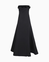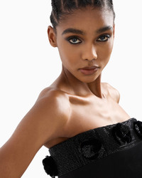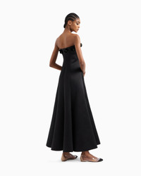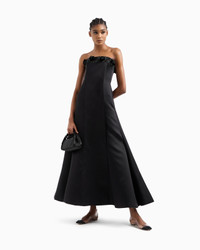 Elegant long dress made from luxurious silk, available in a rich black that enhances the brilliance of the yarn. The bustier style, with removable shoulder straps, features an overlapping central panel, creating a slit and adding movement to the flared skirt that is reminiscent of the corolla of a flower. The detail of the band illuminated by heat-adhesive rhinestones and hand-applied flowers made of velvet and rhinestones adds a sophisticated highlight, completing a perfect offering for evenings and special occasions. Bustier style Removable shoulder straps Internal stays Back central concealed zip fastening Band detail covered with a pave of black heat-adhesive rhinestones Hand-applied flowers made of black velvet and heat-adhesive rhinestones Two side pockets Slit-effect front panel detail Unlined Length: 105 cm Made in Italy Product Code: GW000452AF12252ZZ017