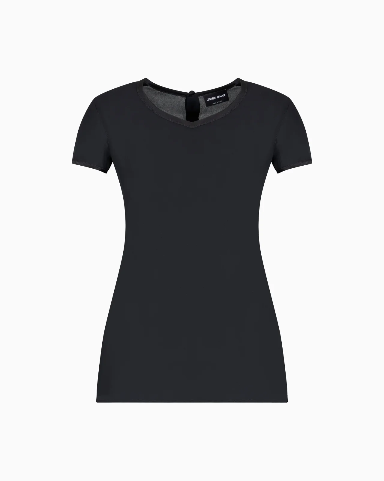 This blouse is the perfect combination of quality and studied details: simply designed, it is an ideal and versatile garment for mixing and matching. Product Code: 8CHCCZ01TZ1361UC99 Details Composition 100% Silk Crepe Basic solid color V-neck Short sleeves Fitting The model is 177 cm and is wearing size 38