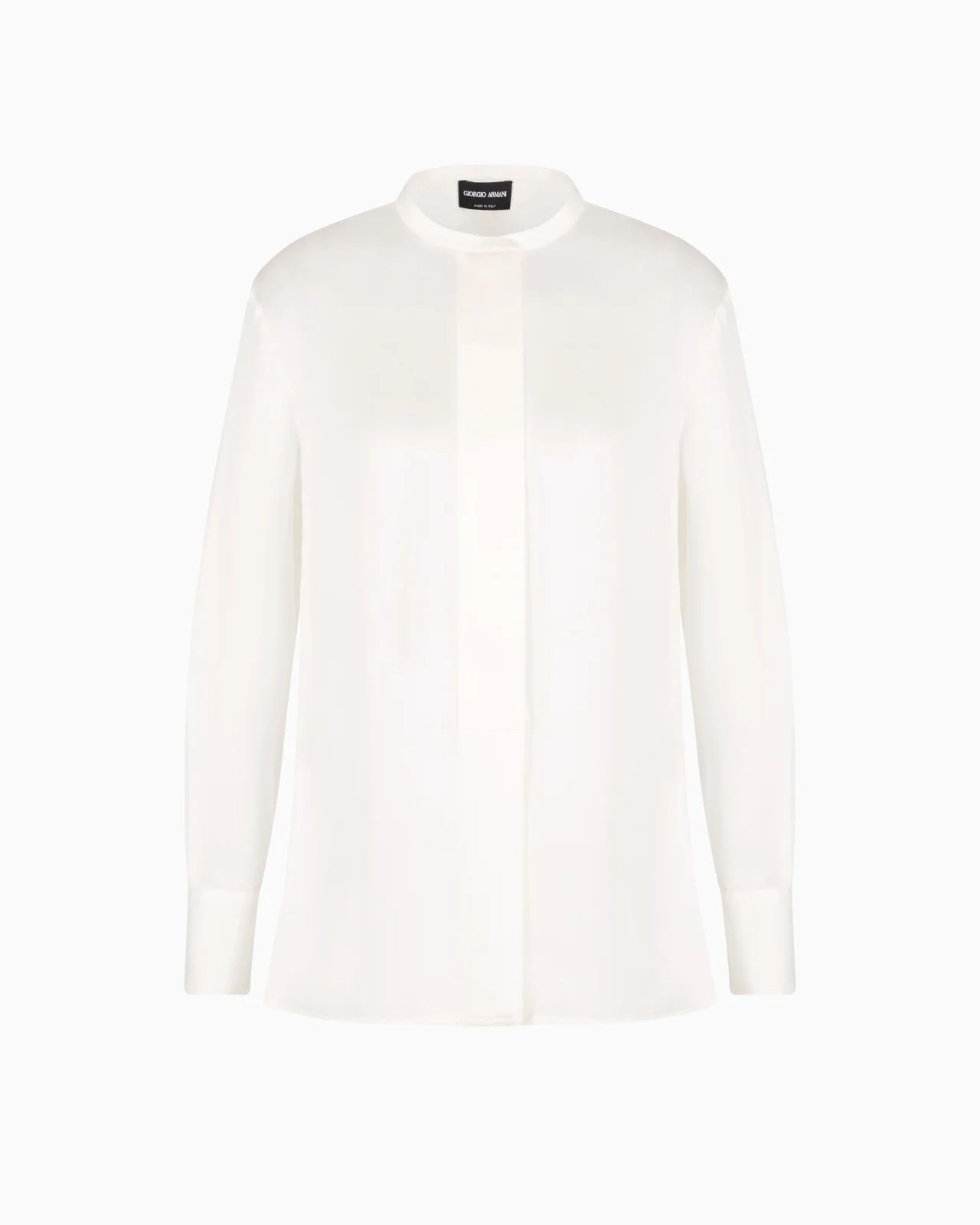 This elegant, silk-charmeuse shirt is defined by an evergreen design. Sophisticated and versatile, it features a guru collar and wide buttoned cuffs, completing formal daytime looks and refined evening outfits when worn with the collection’s trousers and skirts. Product Code: 2WHCC03YT03Q21U1SZ Details Composition 100% Silk Guru collar Long sleeves Faced placket with button closure Back yoke Two-button wide cuffs Made in Italy