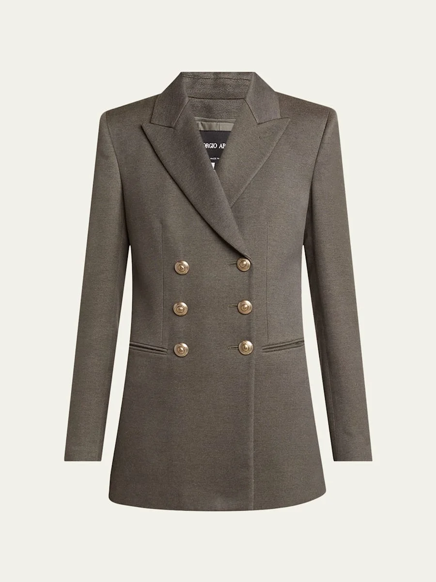 Giorgio Armani blazer jacket in silk-blend Peak lapels; double-breasted front Long sleeves; button cuffs Padded shoulders Hip welt pockets Slim tailored it Walking vent back Button closure Silk/viscose/cotton Dry clean Made in Italy Online Inquiries: BGS21_BA4Z2| Store Inquiries: #5037534