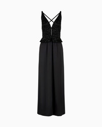 Shiny long dress made of viscose and silk, featuring a plunging neckline, front and back, held only by thin cross-over shoulder straps. The style, consisting of a top with a peplum and a skirt with a front slit, is lit up by sparkling embroidery on a tulle base, created from iridescent sequins and rhinestones, micro baguettes and lurex, producing a sophisticated animal print. An offering designed for the evening and special occasions. Top with V neck and peplum detail Plunging back neckline Long skirt with front slit and drawstring detail Lined Length: 110 cm from the waist Made in Italy Product Code: GW000932AF18627ZZ026