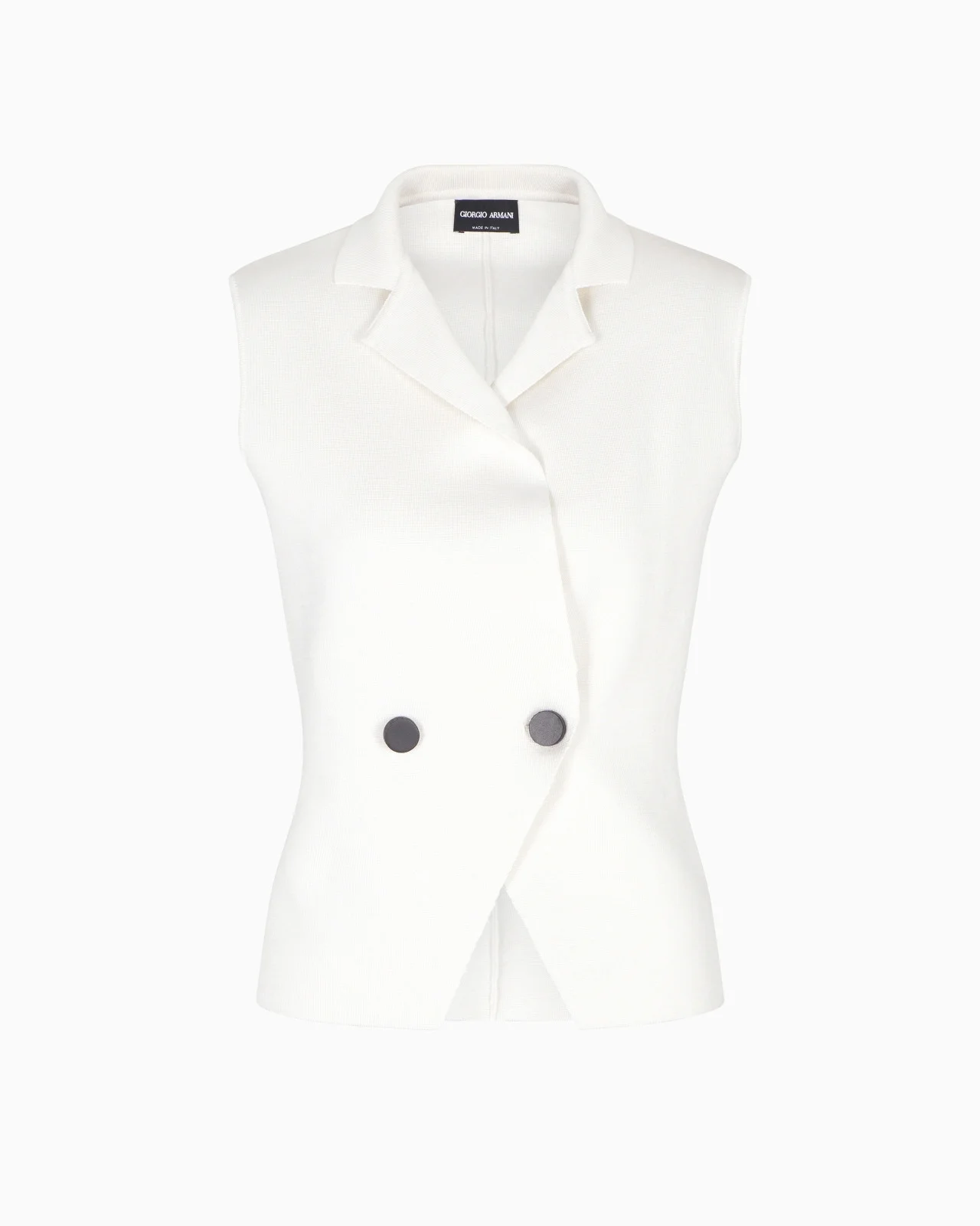 Clean-lined, double-breasted gilet in a silk fabric-stitch knit and defined by ribbed inserts that outline the back and sides. The style, with notched lapels and a special button fastening, expresses the recurring androgynous theme of the collection, lending itself to day-to-night looks teamed with shirts and wide trousers. <br>The garment is part of the Holiday selection, which plays with a minimalist colour palette of black and white, colours that have always been a symbol of sophistication. A colour choice found in the fabrics, embroideries and accessories that express the essence of Armani spirit, distinguished by clean, androgynous-inspired lines, that are still always feminine and sensual. Fineness: 18 Notched lapels Buttoned fastening Rib-knit sides and back Made in Italy Product Code: GW001816AF18794U0002