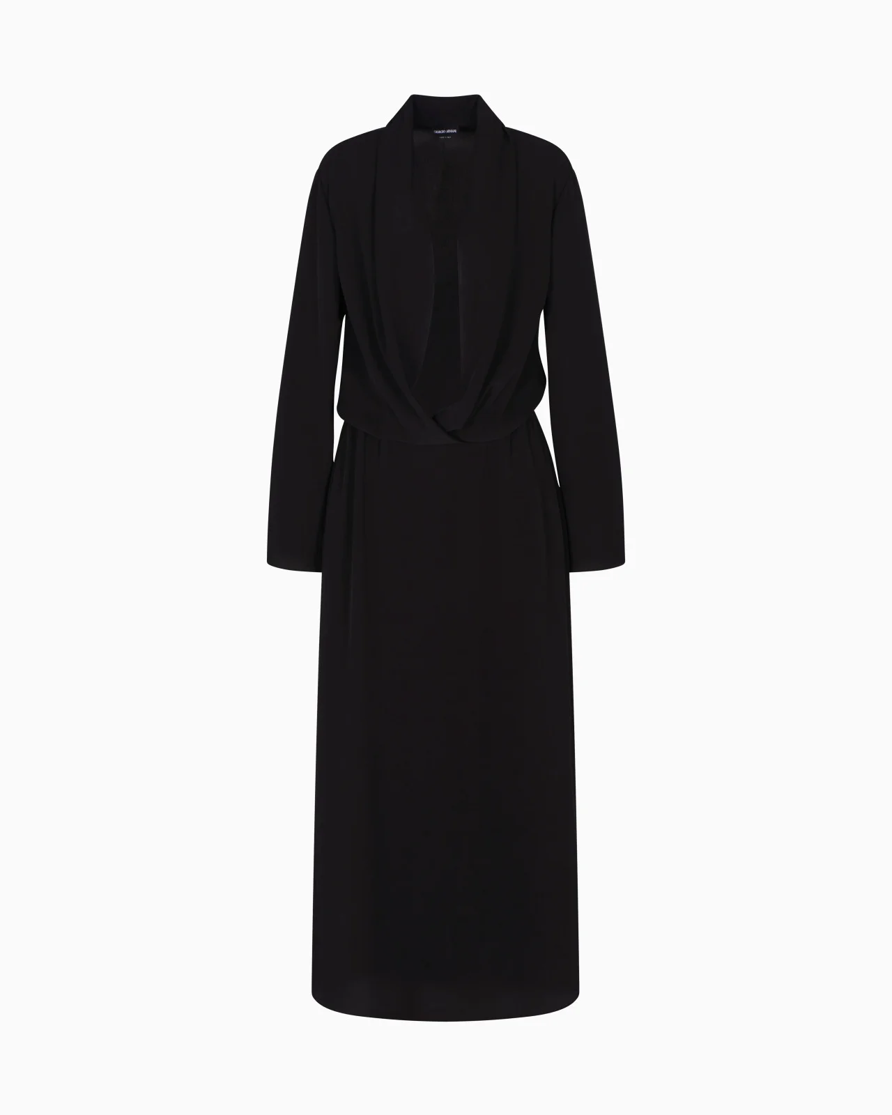 Sophisticated long dress made of silk, made special by the play of overlaps created by the open bodice that reveals a contrasting top sewn inside. The V-neck style with long sleeves is perfect for sophisticated day-to-night looks.<br>The garment is part of the Holiday selection, which plays with a minimalist colour palette of black and white, colours that have always been a symbol of sophistication. A colour choice found in the fabrics, embroideries and accessories that express the essence of Armani spirit, distinguished by clean, androgynous-inspired lines, that are still always feminine and sensual. Draped V-neck Long sleeves Open blouson bodice with contrasting top sewn inside Long skirt with side pockets Unlined Length: 100 cm from the waist Made in Italy Product Code: GW001584AF20134ZZ017