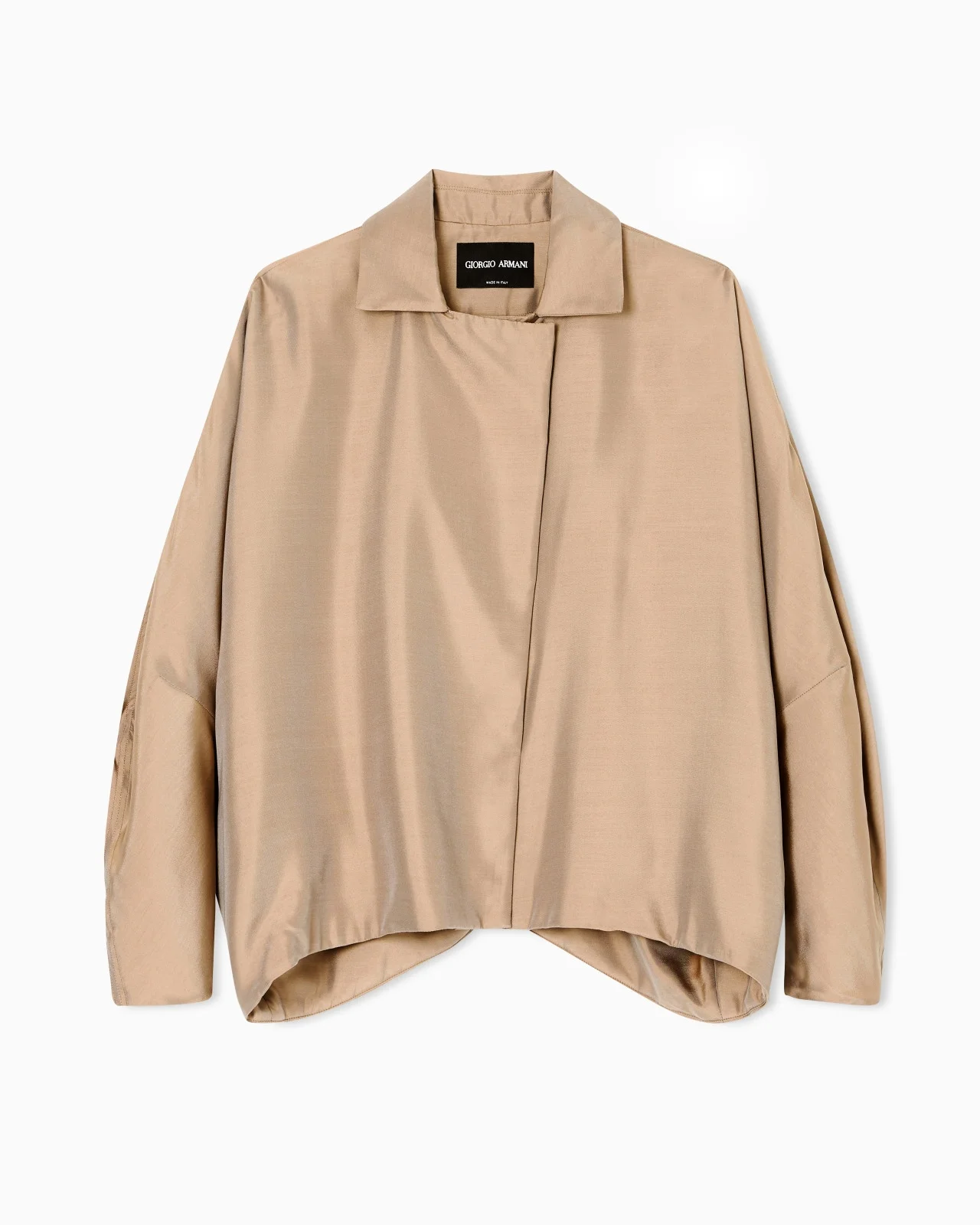 A play on volumes defines this blouson made of silk satin in a bright and natural shade. The style features a shirt collar, press-stud fastening, draped, shaped sleeves and a contoured hem at the back. An item stolen from sportswear, reinterpreted in a refined way, perfect for wearing with daytime looks with a laid-back allure. The piece is part of the New Normal selection, an offering that reinterprets the brand’s archive looks with a modern twist. Pieces in elongated and fluid shapes and with an androgynous flavour dress the feminine silhouette with elegance for day-to-night looks. This season it comes in a natural colour palette animated by a series of chevron motif and houndstooth shapes, a clear reinterpretation of pieces "stolen" from the male wardrobe with a feminine twist. Shirt collar Concealed press-stud closure Shaped wide sleeves Contoured back hem Lined Length: 60 cm from centre back Made in Italy Product Code: GW002325TE18011M6208