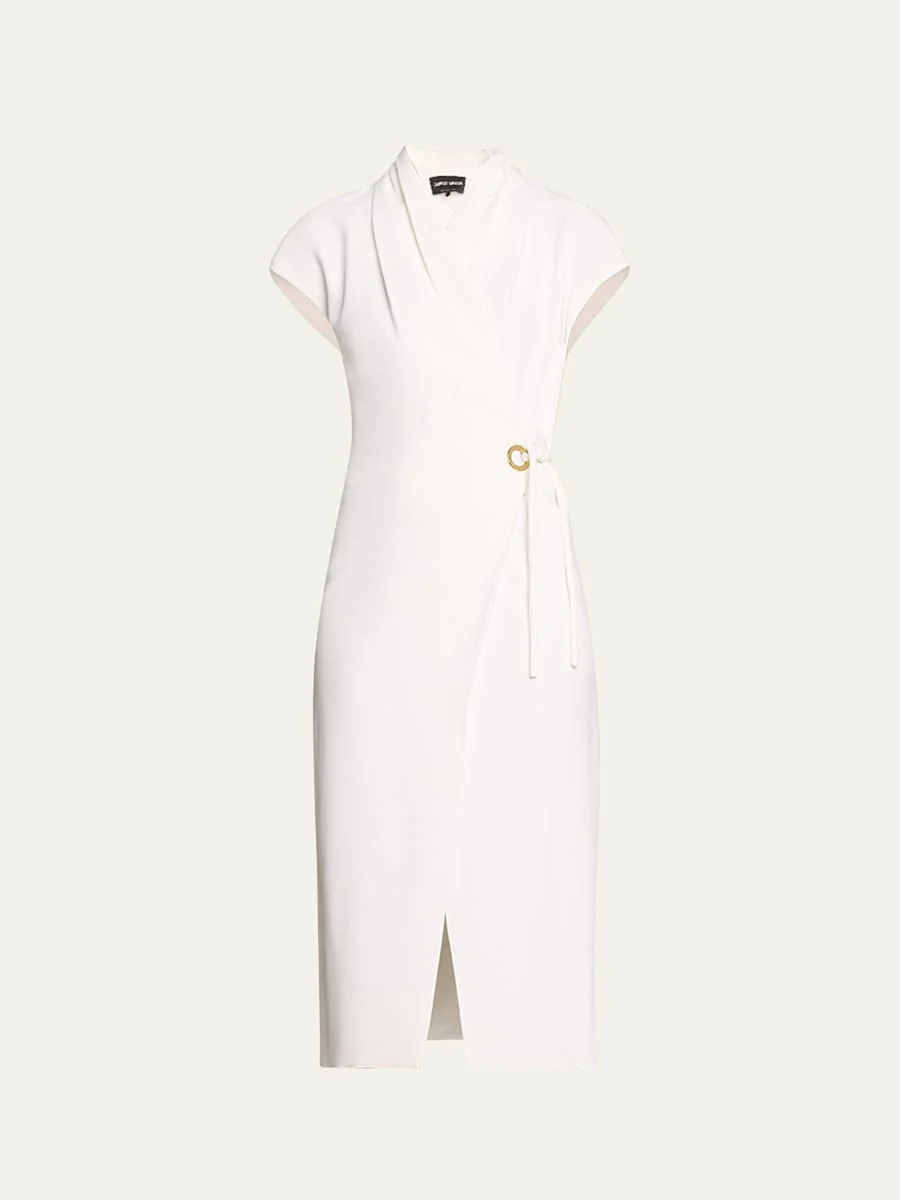 Giorgio Armani silk wrap midi dress features self-tie closure at the hip with gold-tone detail V-neckline Short sleeves Hem hits around the knee A-line silhouette Viscose/elastane Dry clean Made in Italy Model is 5'10"/177cm. Online Inquiries: BGS21_T5D94| Store Inquiries: #4690329