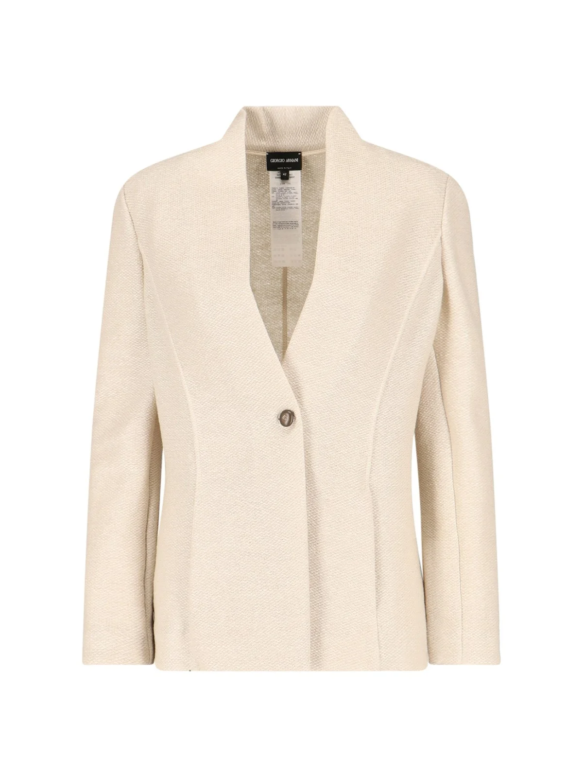 GIORGIO ARMANI SINGLE-BREASTED BLAZER IN CREAM COTTON BLEND WITH LONG SLEEVES, BUTTON CLOSURE, TWO SIDE POCKETS, BACK SPLIT DETAIL, STRAIGHT HEM. PRODUCT INFO PRODUCT CODE GW003164 AF15651U1009 COMPOSITION: 56% COTTON, 44% POLYAMIDE SIZE AND FIT: REGULAR FIT MADE IN: ITALY