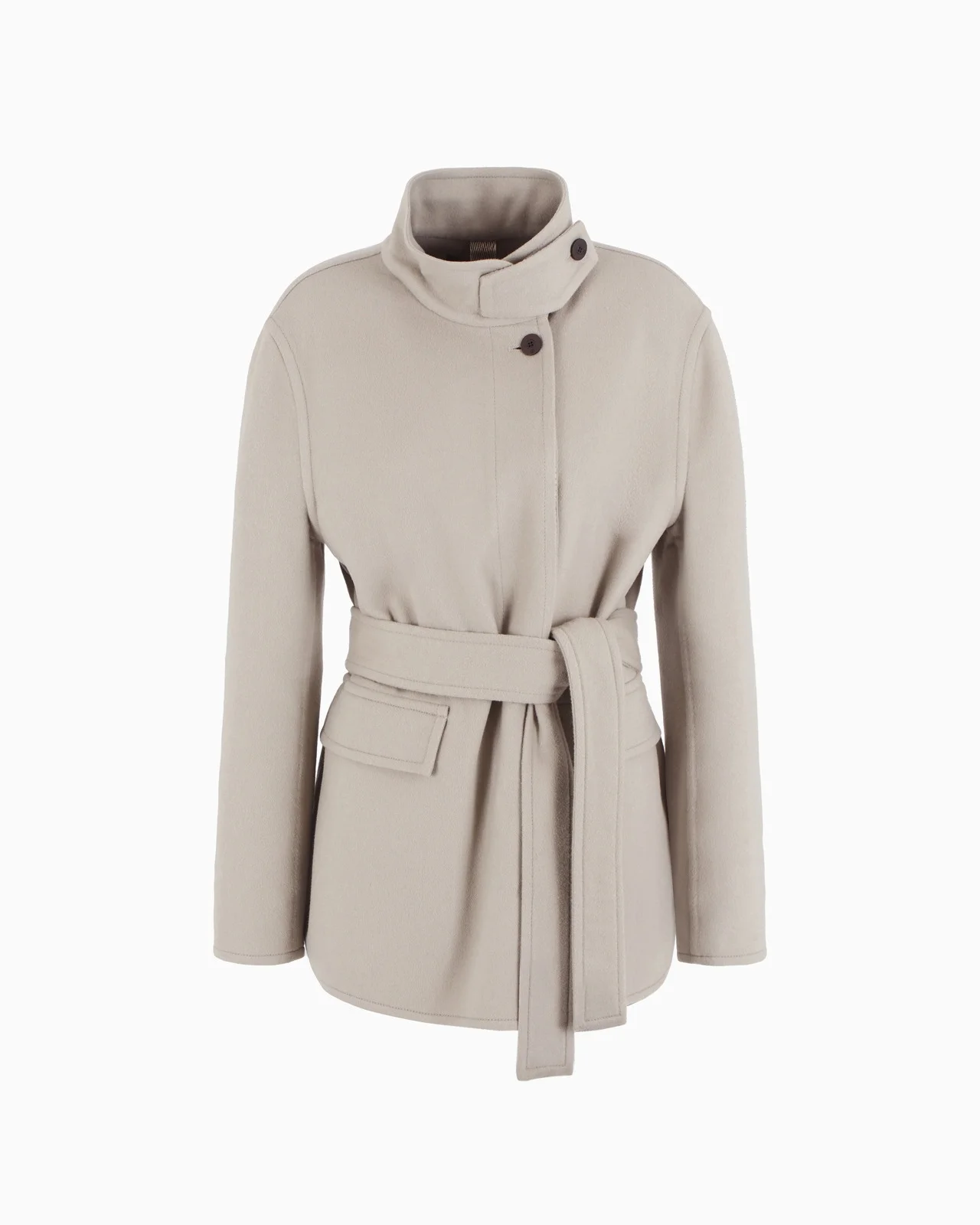 Sophisticated single-breasted pea coat made from extremely soft, warm cashmere. The style features a concealed button closure and belt, and large flap patch pockets. The garment, bonded in the same fabric, a detail that highlights its sophistication due to its versatile style, elegantly completes numerous looks for day or night. Product Code: GW000232TE101121U6092 Details Composition 100% Cashmere Regular fit Stand collar with strap and button detail Concealed button closure Belted waist Two patch pockets with flap Double-layered fabric Length: 71 cm Made in Italy Fitting The model is 178 cm tall and is wearing size 38/S