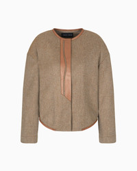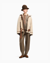 Single-breasted jacket made of virgin wool and cashmere with an unusual knit effect. The style, with relaxed volumes and a rounded hem, is embellished with piping and a central insert made of contrasting leather, details that underline its sophisticated spirit. An offering designed to accompany daytime looks, perfect with relaxed-fit trousers and silk shirts. The piece is part of the New Normal selection, an offering that reinterprets the brand’s archive looks with a modern twist. Pieces in elongated and fluid shapes and with an androgynous flavour dress the feminine silhouette with elegance for day-to-night looks. This season it comes in a natural colour palette animated by a series of chevron motif and houndstooth shapes, a clear reinterpretation of pieces "stolen" from the male wardrobe with a feminine twist. Crew neck Long sleeves Closure with concealed press studs Rounded hemline Contrasting leather inserts and piping Unlined Length: 56 cm from centre back Made in Italy Product Code: GW001614TE16708M6003