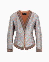 Form-fitting short jacket crafted from an embroidered silk blend. The style is distinguished by a V neck, concealed front closure and centre back vent. A refined, luxurious offering, illuminated by all-over embroidery made of beads and sequins, elegantly accentuating the feminine silhouette. Single-breasted jacket V neck Neckline, cuffs and hem with embroidery Single-breasted closure with concealed button Long sleeves with contoured elbows Central back vent Length: 53 cm Made in Italy Product Code: GW000676AF17415ZZ017