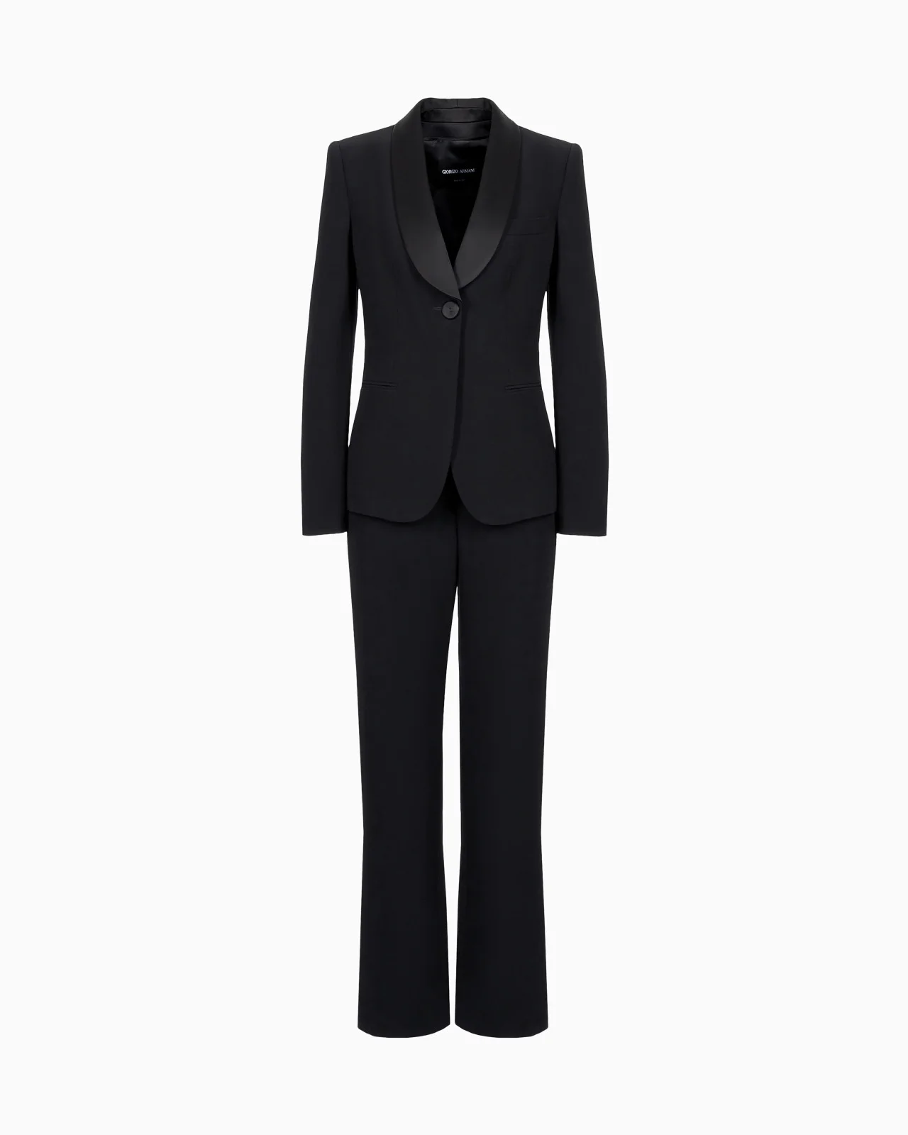 The classic men’s tuxedo takes on a seductive and feminine style in this pure silk suit. Single-breasted, slim-fit and tone-colour fabric jacket with large lapels. The relaxed, flared-cut trousers have stitched pockets. Product Code: 8CHAT001T00EV1UC99 Details Composition 100% Silk Tuxedo composed of: Single-breasted jacket Single-button closure Satin shawl-lapel collar Single-button cuffs Two welt pockets Straight trousers with satin waistband and side zip fastening Made in Italy Fitting The model is 178 cm tall and is wearing size 38/S
