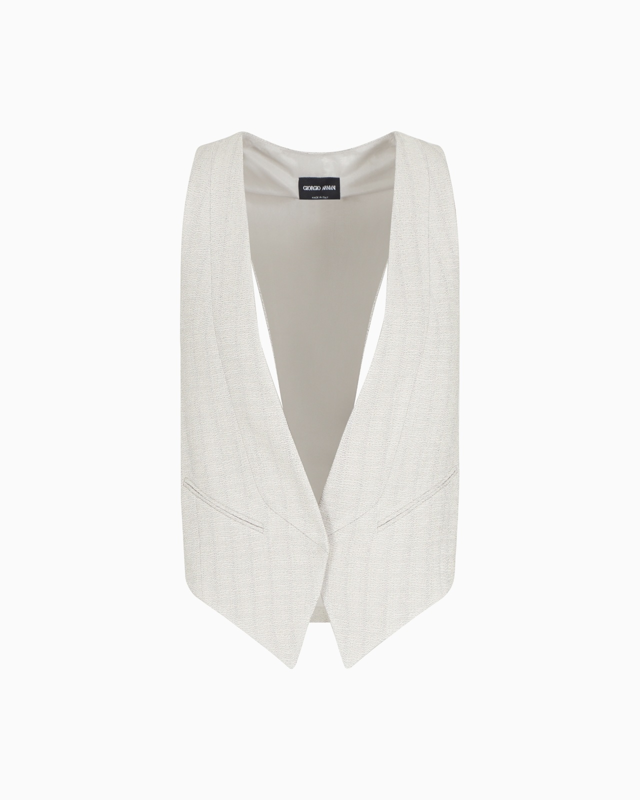 A plunging V neckline defines this single-breasted waistcoat made from armure viscose crepe. The style has two slanted welt pockets and contoured openings at the back. A feminine and versatile offering, perfect for wearing with the collection’s shirts. Single-breasted waistcoat V neck Front closure with press stud Two slant welt pockets Symmetrical openings at the back Lined Made in Italy Product Code: GW000794TE13898M8024