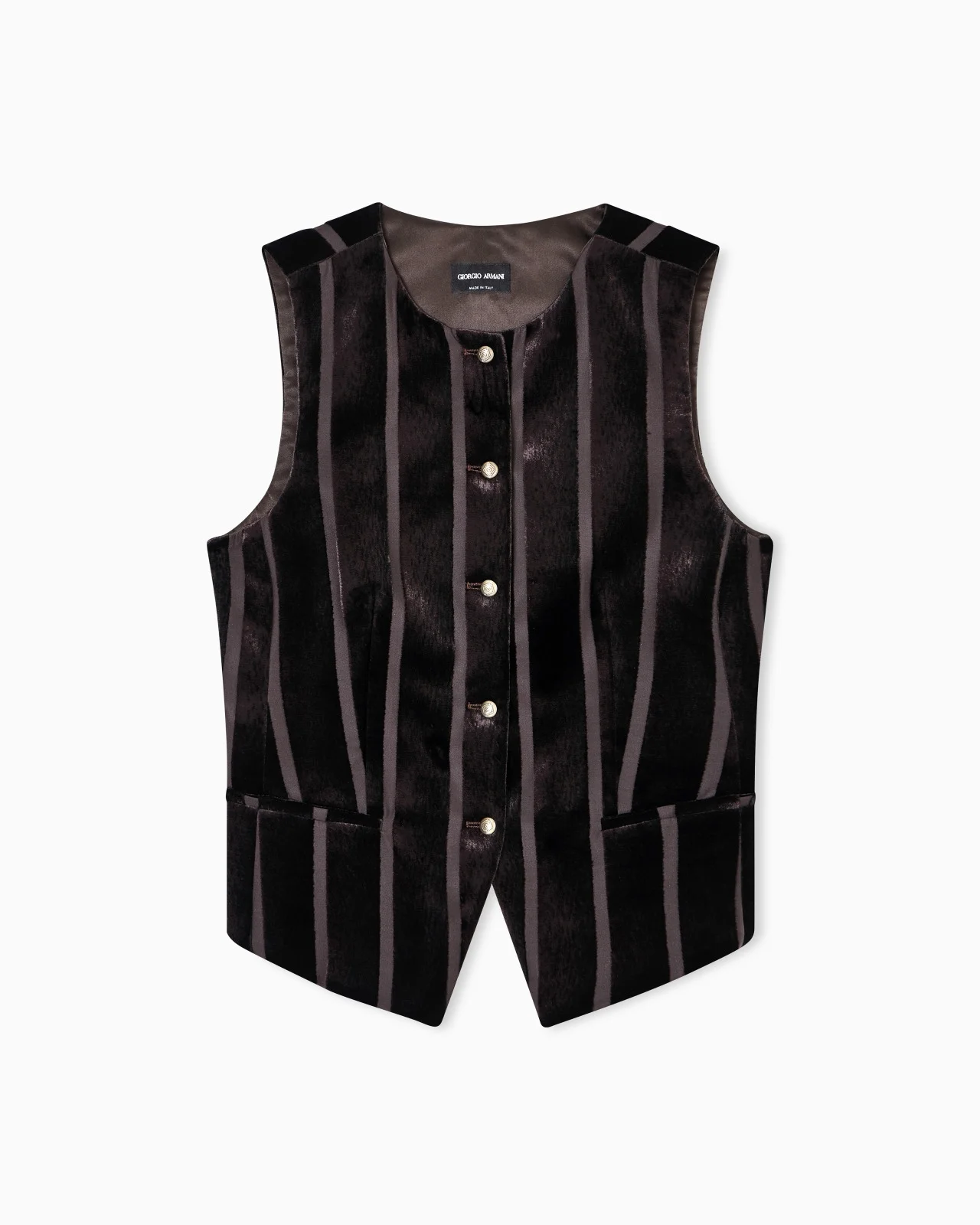 Single-breasted velvet waistcoat, embellished with a refined vertical striped motif obtained through a devore technique, creating a delicate play of transparency and texture. Defined by a round neckline and front closure, the style has a clean, slightly contoured shape that elegantly dresses the silhouette. A perfect piece to add a sophisticated touch to daytime outfits or to team with the matching trousers for a statement complete look. Single-breasted waistcoat Crew neck Front closure with gold-finish metal buttons Two small welt pockets Lined Made in Italy Product Code: GW001588TE16785M6002