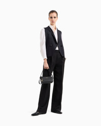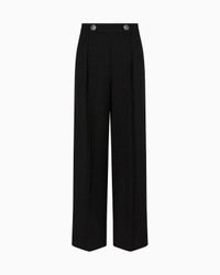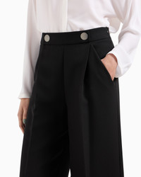 Single-pleat wide-leg trousers made of silk crepe cady in black and white and featuring a slinky, relaxed fit. This style is given a twist with two buttons on the front, highlighting the waist. A clean and essential day-to-night offering, perfect with tops and jackets from the collection.<br>The garment is part of the Holiday selection, which plays with a minimalist colour palette of black and white, colours that have always been a symbol of sophistication. A colour choice found in the fabrics, embroideries and accessories that express the essence of Armani spirit, distinguished by clean, androgynous-inspired lines, that are still always feminine and sensual. Trousers with front crease Waistband with two special buttons Side zip closure Two side slant pockets Unlined Length: 115 cm Made in Italy Product Code: GW001562TE16469UC001