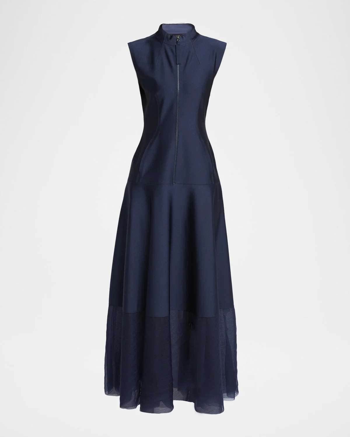 Giorgio Armani dress is crafted from sheen stretch scuba accented with a drop waist leading to a tiered skirt with a sheer panel Band collar; half-zip front Sleeveless Fit-and-flare silhouette Floor length Slipover style Nylon/polyamide/elastane Dry clean Made in Italy