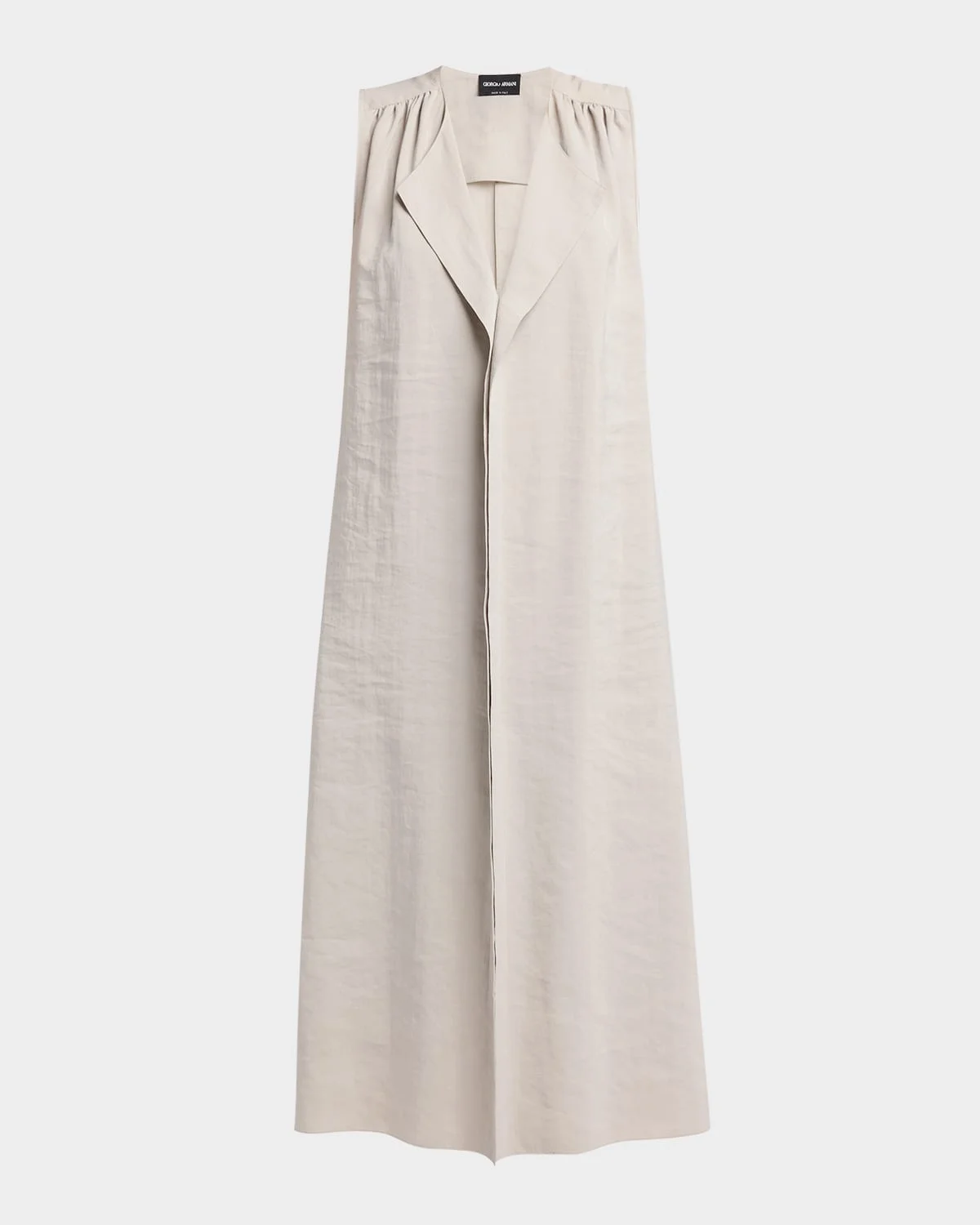 Giorgio Armani shirtdress is crafted from & nbsp;washed technical silk, accented with & nbsp;small lapels on the neckline, a front slit, and & nbsp;a self-belt accentuating & nbsp;the silhouette in a feminine and impeccable way. Part of the New Normal selection, reinterpreting & nbsp;the brand's archive looks with a modern twist. Round neckline; split V front Sleeveless Self-tie belted waist Shift silhouette Full length Slipover style Silk/polyester Dry clean Made in Italy