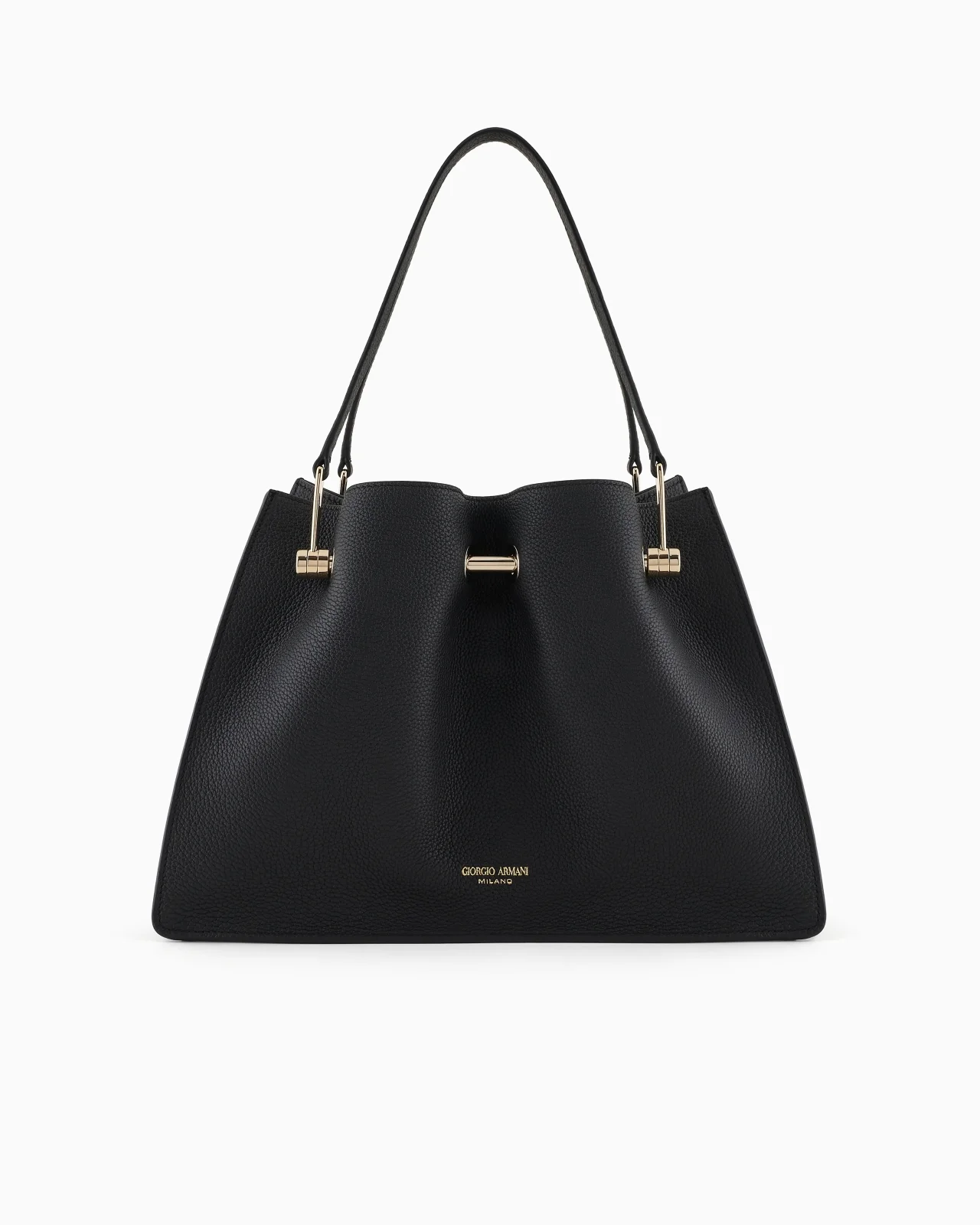 A heritage-inspired piece that recalls some of the brand’s hallmark styles, such as clean lines and a relaxed, deconstructed attitude. Made of pebbled leather, it features an internal press stud closure and gold-tone metal bar detail that retains the leather handles, creating a subtle gathered effect. A exceptionally sophisticated luxurious accessory, perfect for daytime use. Press-stud closure Two leather handles Gold-metal bar detail Heat-stamped Giorgio Armani logo Interior pocket with zip One patch pocket Measurements: 21 x 31 x 14 cm Made in Italy This bag is perfect for holding your lipstick, phone, card holder and keyring Product Code: GW000836AF14187UC001