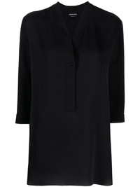 V-neck silk blouse Spun from silk, this Giorgio Armani blouse arrives in a navy-blue hue for the AW23 collection. Cut to a V-neck silhouette, it features a subtle button closure. Highlights - Navy blue - Silk - V-neck - Front button fastening - Three-quarter length sleeves - Straight hem Made in Italy Composition Silk 100% SIZE & FIT Model measurements Height 5 ft 10 in(1.78 m) Bust/Chest 30.7 in(78 cm) Hips 34.64 in(88 cm) Waist 23.22 in(59 cm) FittingInformation Designed to be unstructured, offering a loose fit throughout Made from a lightweight non-stretch fabric This piece fits true to size – take your usual size