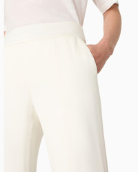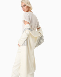 Clean-lined trousers made from lustrous double silk satin. The style features a smooth strap, two side pockets and a small front slit at the cuffs. A relaxed piece that complements many looks to perfection. The garment is part of an exclusive capsule collection dedicated to special occasions, reflecting the iconic vision of elegance through the brand’s style codes. A glamorous item in a white and silver colour palette, with unexpected touches of turquoise, and shimmering embroideries and appliques that provide sophisticated sparkles. Product Code: 4SHPP11DT02AT1U1SS Details Composition 100% Mulberry silk Smooth waistband Back central zip fastening Two side welt pockets Front slit Cuff width: 20 cm Made in Italy