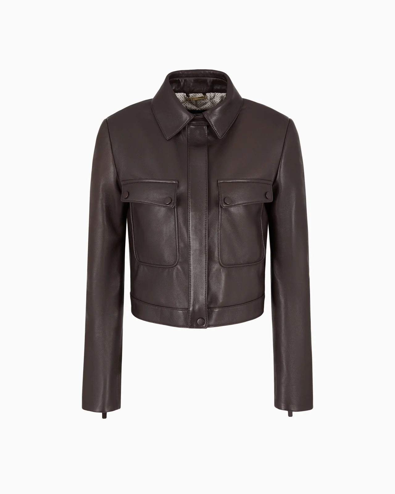 The leather jacket is revisited in Giorgio Armani style. Crafted in soft, glove-quality nappa leather, it is defined by a shirt collar, concealed zip fastening, two flap patch pockets and cuffs with zip opening. Warmed by light padding and embellished with the collection’s printed lining, it completes many daytime looks with a daring, laid-back touch. Shirt collar Concealed zip closure Two patch pockets with flap and press studs on the chest Zipped sleeve cuff detail Collection twill lining with print and padding in diamond effect Hanging sleeves Length: 47 cm from the centre back Made in Italy Product Code: GW000350AF11868U8125