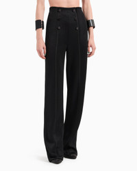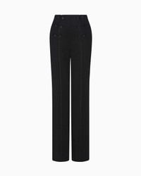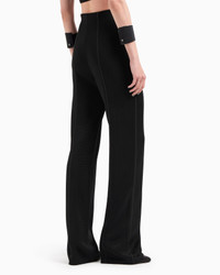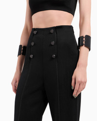 Clean lines, inspired by a men’s uniform, define these stitched-fabric viscose jersey trousers. The style, with a side concealed zip fastening, is distinguished by the detail with applied buttons and the matching stitching motif that highlights its elongated silhouette. A perfect offering to complete different looks with a sophisticated touch.<br>The garment is part of the Holiday selection, which plays with a minimalist colour palette of black and white, colours that have always been a symbol of sophistication. A colour choice found in the fabrics, embroideries and accessories that express the essence of Armani spirit, distinguished by clean, androgynous-inspired lines, that are still always feminine and sensual. Side zip closure Symmetrical applied buttons detail Matching stitching Made in Italy Product Code: GW001824AF18796UC001
