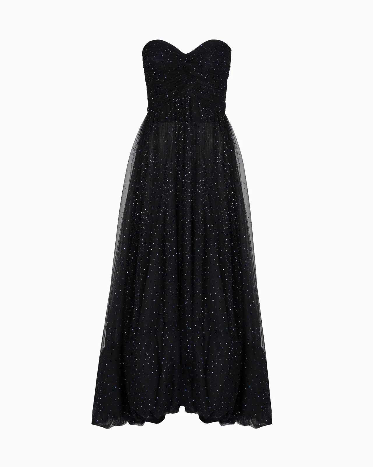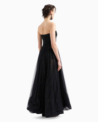 Elegant and dramatic, light as a feather, this bustier dress made from tulle is perfect for dressing up special occasions. Featuring a sweetheart neckline and a slightly draped bodice, it is illuminated by a dense motif of heat-adhesive rhinestones, in shades of light blue, silver and blue, that recreates the magic of a winter starry sky. A romantic offering designed to turn heads. Heart-shaped neckline Back central zip fastening Wide skirt in black tulle with all-over heat-adhesive rhinestone embroidery in blue and light blue Unlined Made in Italy Product Code: GW000617AF13613ZZ017