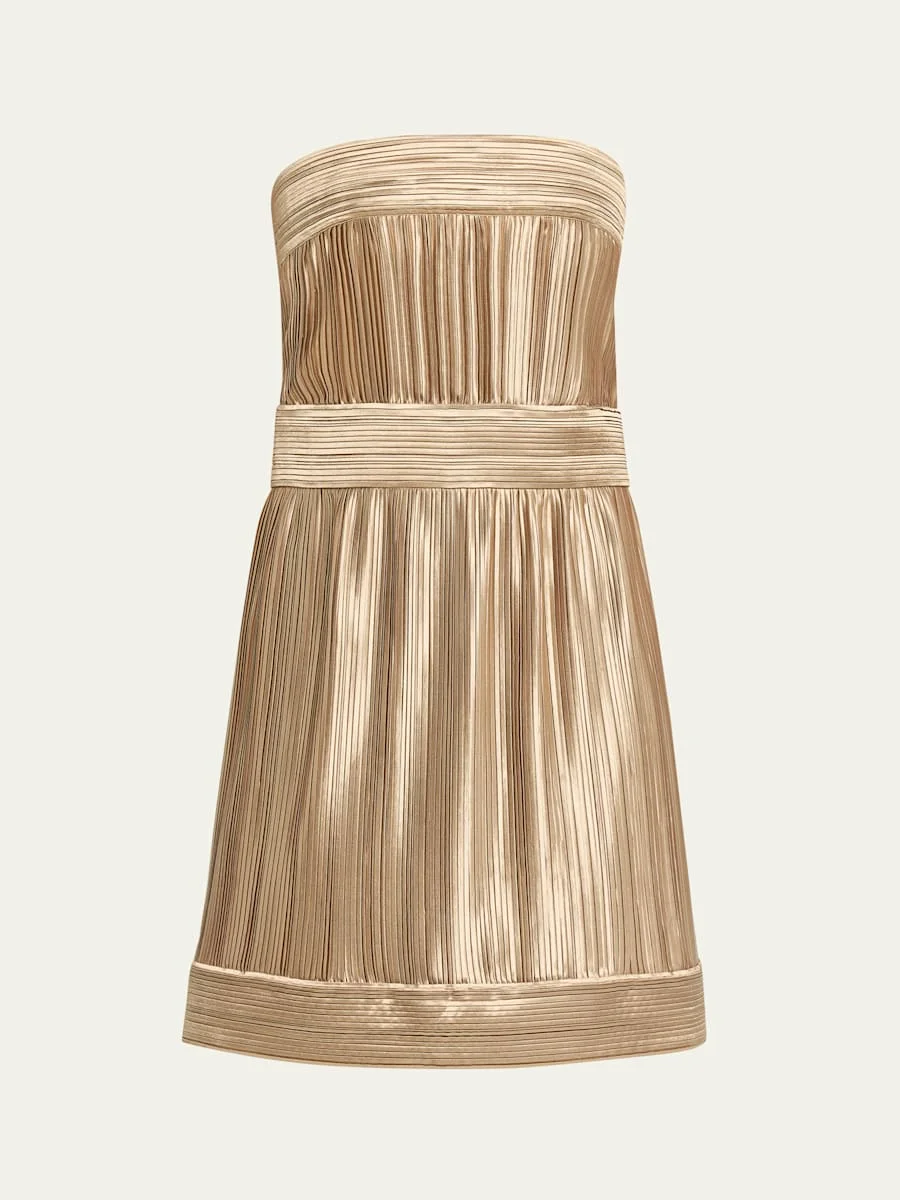 Crafted from metallic plisse satin, this dress from Giorgio Armani features a strapless bustier silhouette with horizontal pleating along the neckline, waist, and hem Strapless neckline Sleeveless Sheath silhouette Midthigh length Invisible back zip Polyester Made in Italy SIZE amp; FITModel measurements: 5'10" tall Model is wearing a US size 4/Small