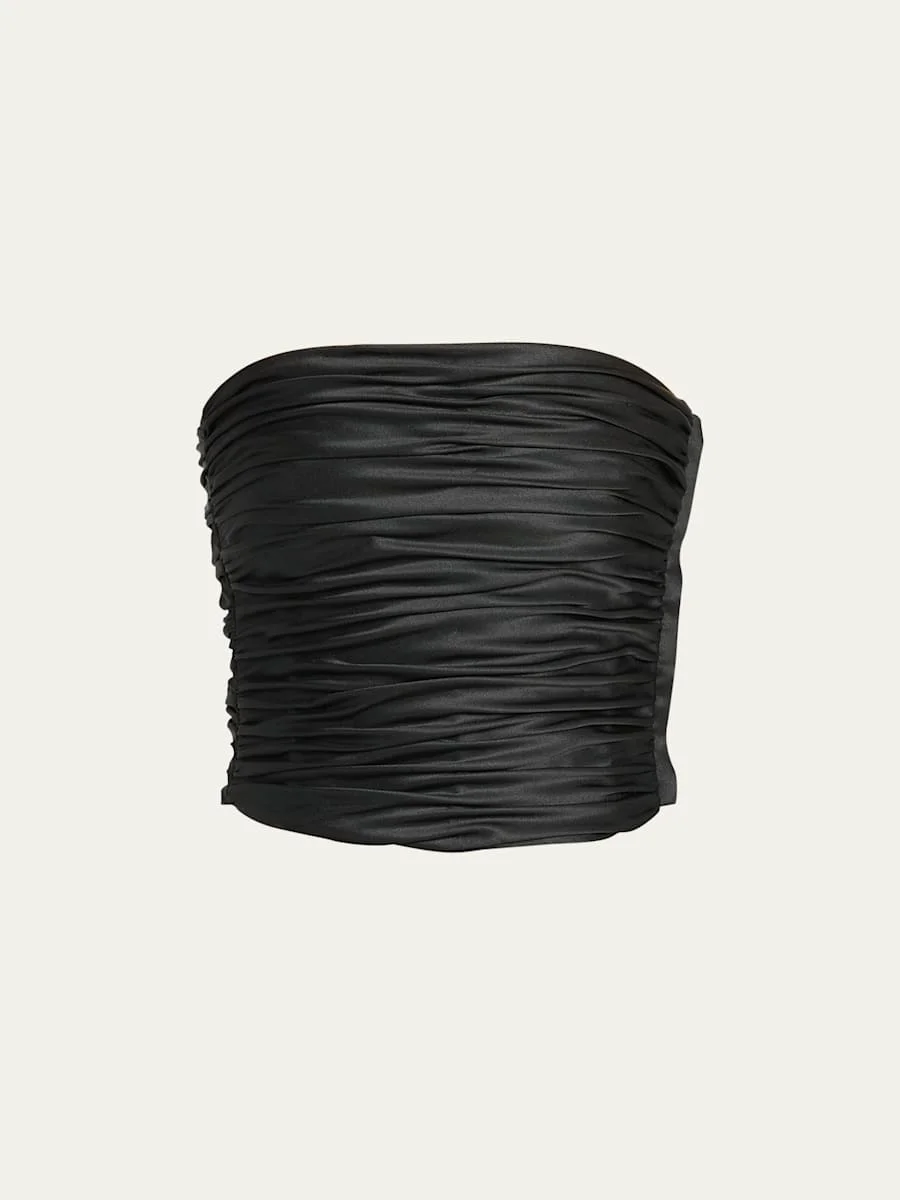 Giorgio Armani satin bustier top with ruched detail Strapless neckline Sleeveless Fitted Slipover style Silk/silk Dry clean Made in Italy Model is 5'10"/177cm. Online Inquiries: BGS21_T5D8W| Store Inquiries: #4690302