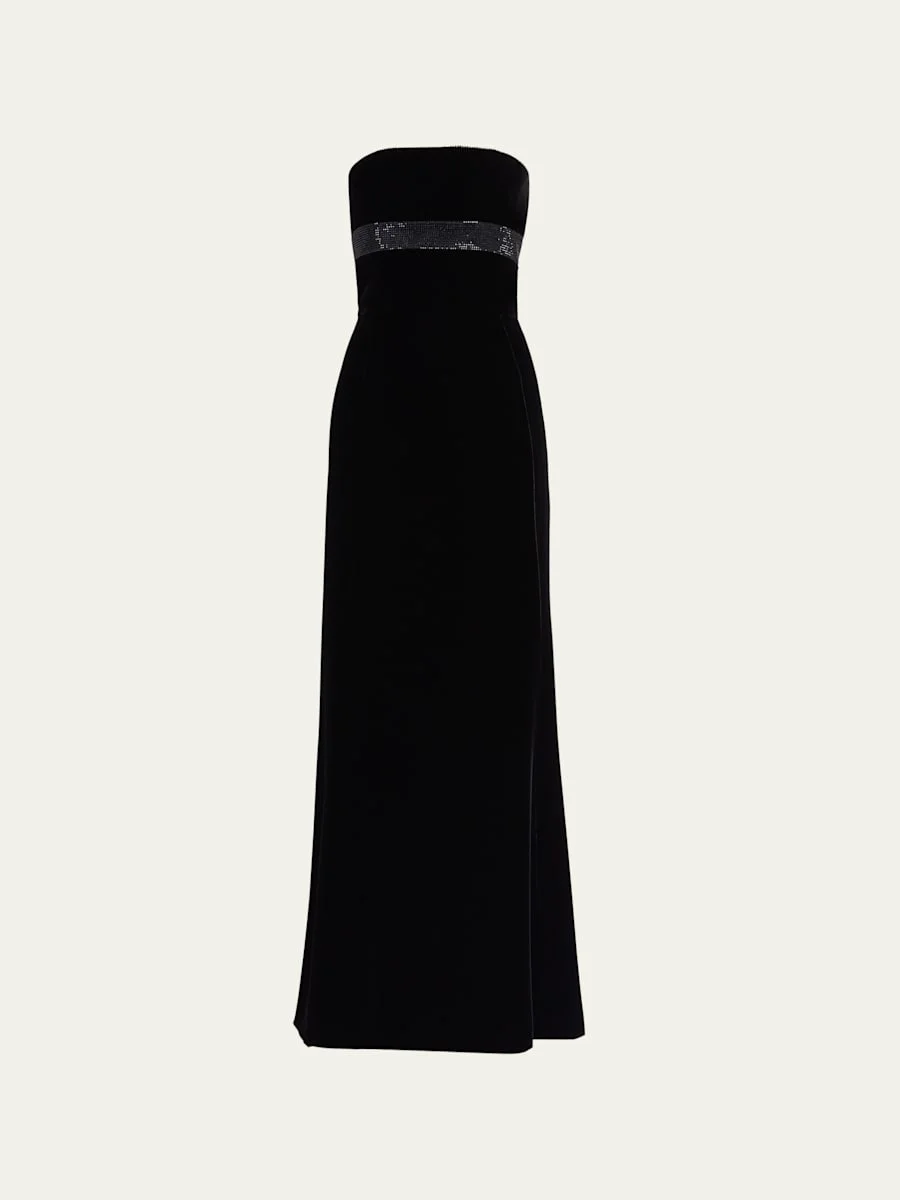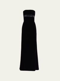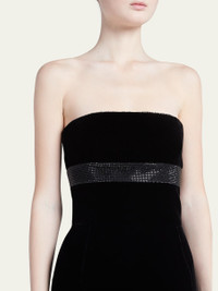 Giorgio Armani velvet gown featuring crystal strass embellished band and an empire waist Strapless neckline Sleeveless Trumpet silhouette Floor sweeping hem Invisible back zip Viscose/silk/polyester Lining: Silk Dry clean Made in Italy Model is 5'10"/177cm. Online Inquiries: BGS21_T50T6| Store Inquiries: #4610913