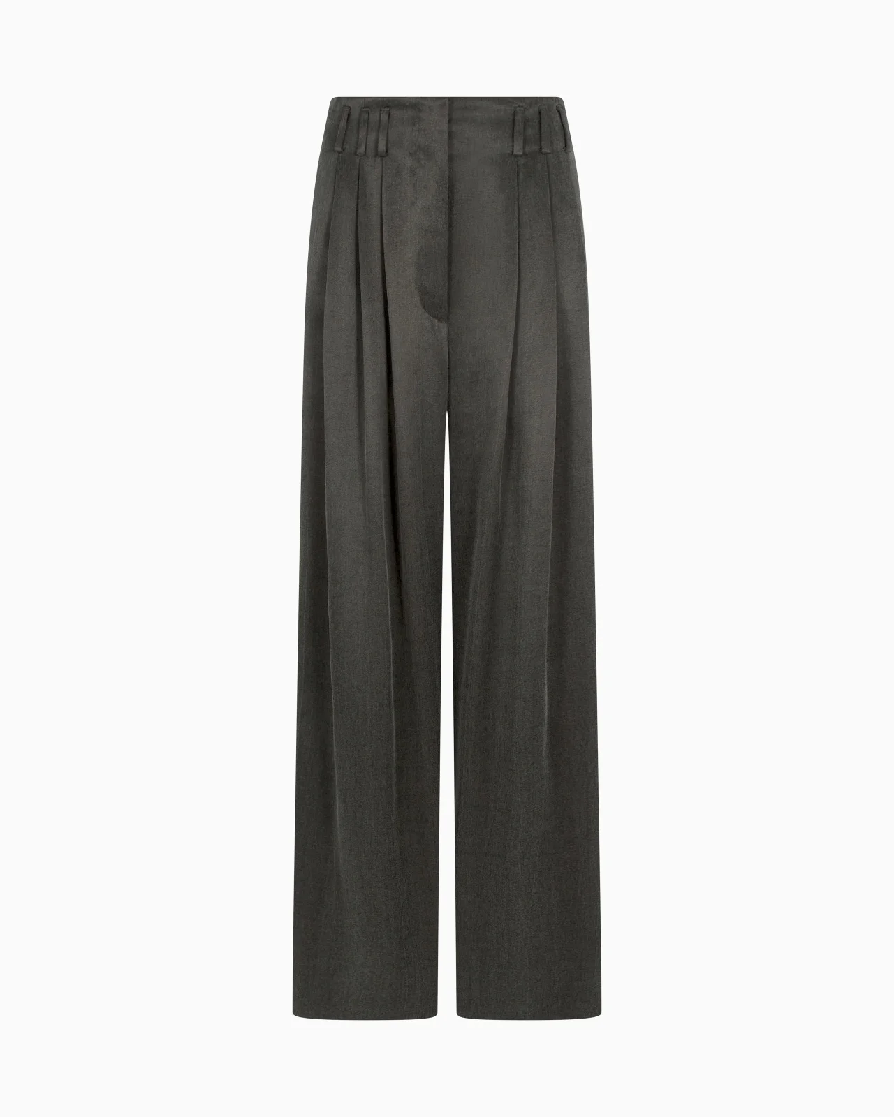 Refined lines for these trousers made from viscose and cupro, offered in the season's colour palette. The style has a zip fastening and two side pockets, and features front pleats which add movement and volume. Sophisticated and feminine, they dress the silhouette with elegance, completing daytime looks paired with the collection’s jackets and shirts. Waistband with belt loops Concealed zip-and-hook closure Two side pockets Unlined Made in Italy Product Code: GW000646TE13750U8119