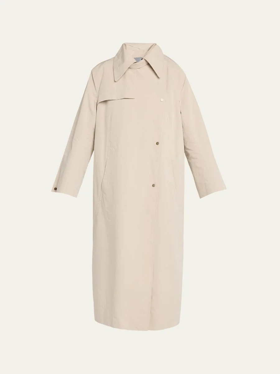 Crafted from techno polyesterblend, this trench coat from Giorgio Armani is minimally designed with snap button closures and a long straight silhouette Point collar with throat latch; snapconcealed zip front Long sleeves; snap cuffs Drop shoulders Chest gun flap Hip wel tpockets Straight fit Hem falls below the knee Walking vent back Polyester/nylon/polyamide Dry clean Made in Italy SIZE amp; FITModel measurements: 5'10" tall Model is wearing a US size 4/Small