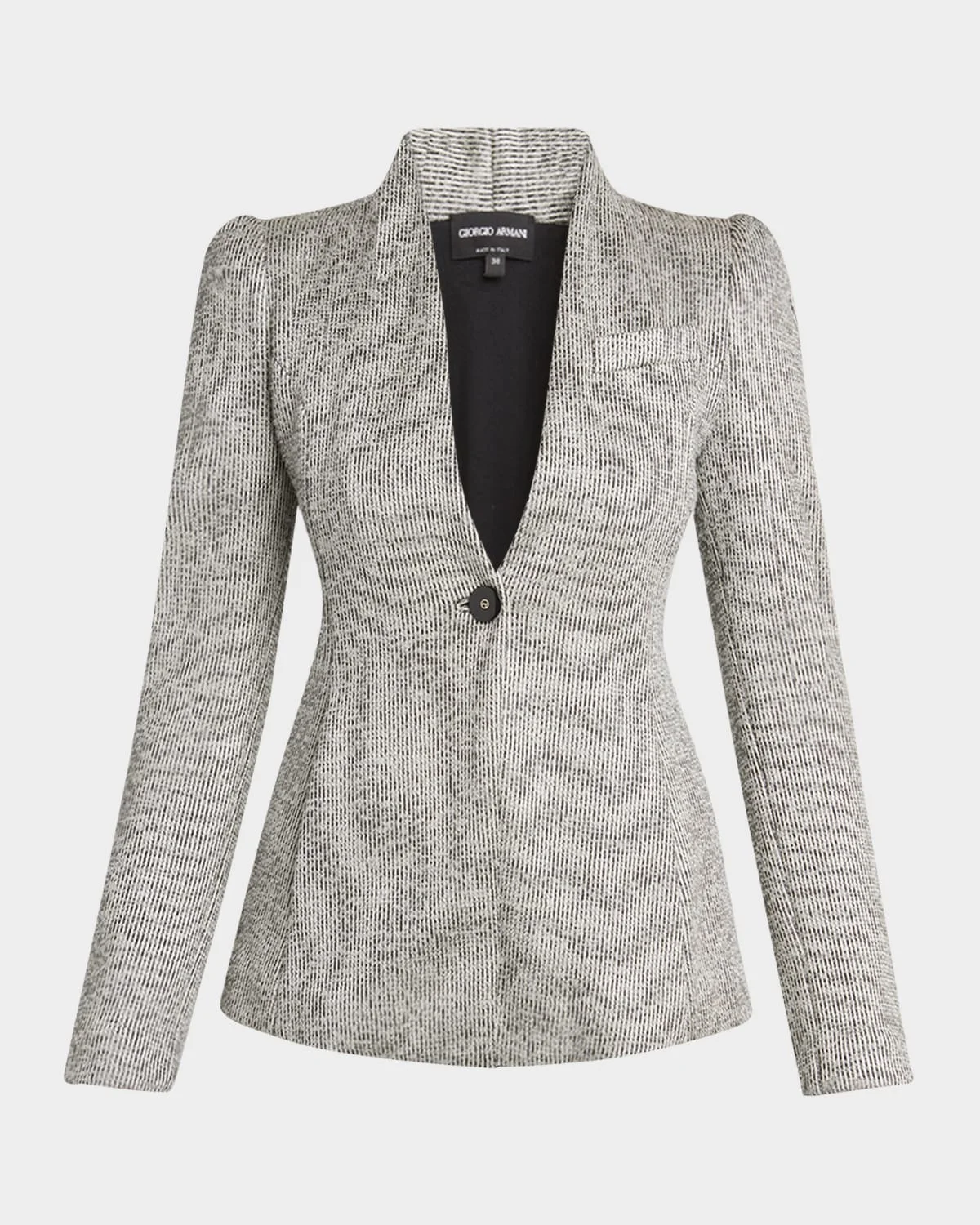 - Giorgio Armani blazer in textureed jersey jacquard - Collarless V neckline; single-breasted front - Long sleeves - Chest wel tpocket - Side split pockets - Slim fit - Vented back - Button closure - Viscose/polyester - Dry clean - Made in Italy