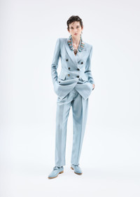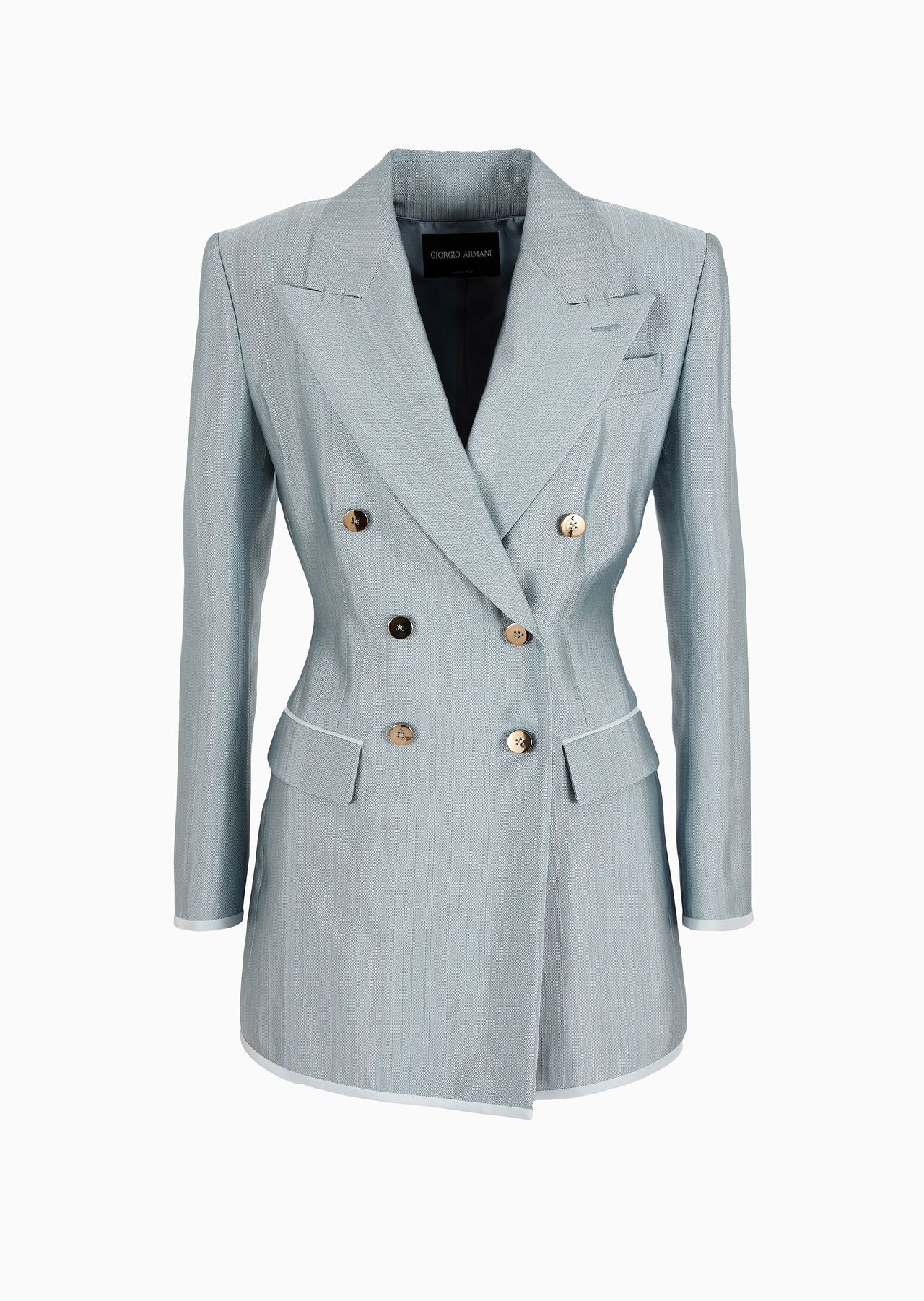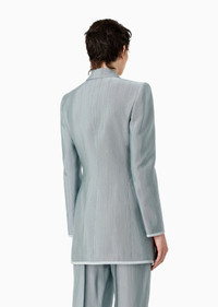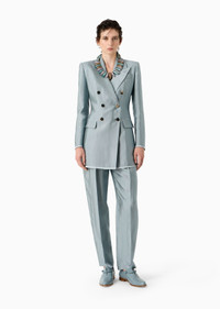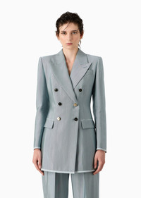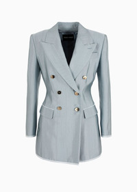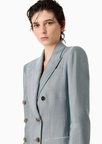 Sophisticated double-breasted jacket, made of armure viscose with a distinctive shiny finish. This masculine-inspired style has large peak lapels, two flap pockets, a breast pocket and contrasting piping. Deliberately elongated and well-defined lines enhance the feminine silhouette in quintessential Armani style. Product Code: 4SHGG15LT04T31U880 Details Composition 100% Viscose Double-breasted jacket Peak lapels Double-breasted closure with six special buttons Two flap pockets Breast welt pocket Contrasting piping details on the pocket edges, cuffs and hem Lined Length: 75 cm from centre back Made in Italy Fitting The model is 178 cm tall and is wearing size 38/S