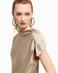 Clean, essential lines define this long dress in double silk satin. The style features a slightly raised collar, short cap sleeves and side slits. Embellished with a panel detail on the left shoulder, it is an elegant and sophisticated piece that is perfect for evening wear, especially when illuminated with exquisite accessories. Slight upright collar Short cap sleeves Panel detail on left shoulder closed by three buttons Two side pockets Side slits Unlined Made in Italy Product Code: GW000678TE10101U8048